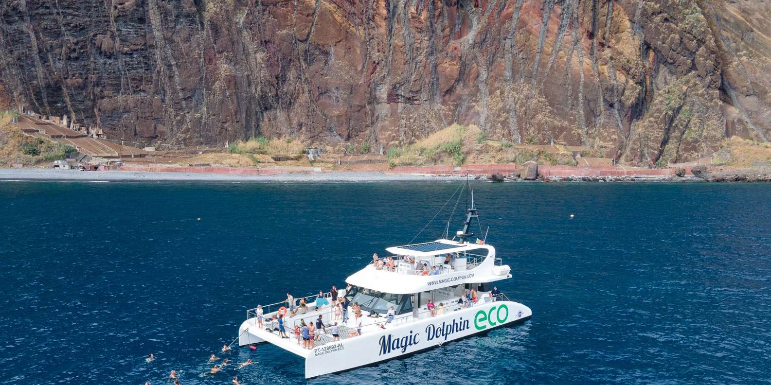 Erlebe das ultimative Delfin- und Walbeobachtungserlebnis auf unserem speziell angefertigten Öko-Katamaran. Fahre bequem vor der Küste entlang, um die Meeresbewohner zu beobachten, und besuche dann Cabo Girão, um ein erfrischendes Bad zu nehmen.