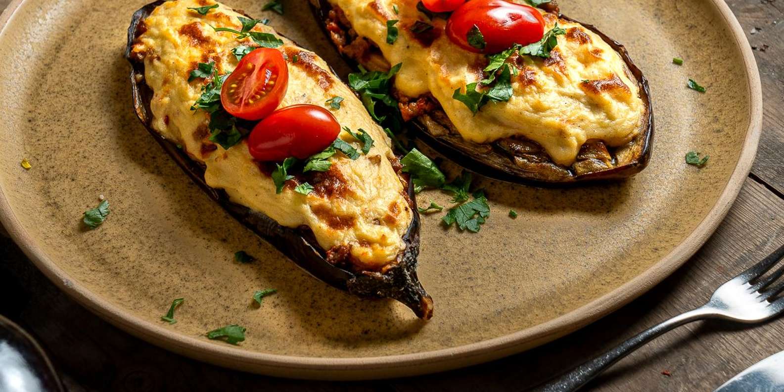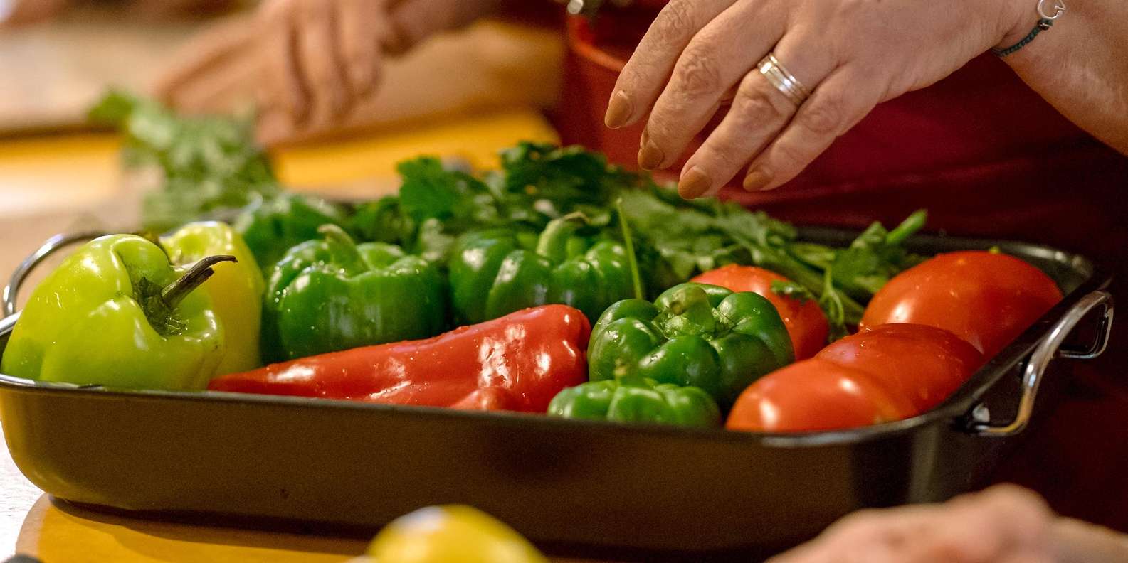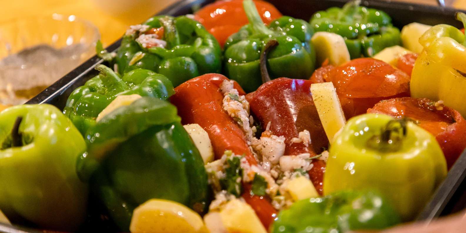 wie Yemista: Im Ofen gebackene Tomaten und Paprika, gefüllt mit Reis, frischem Gemüse, Kräutern und nativem Olivenöl extra