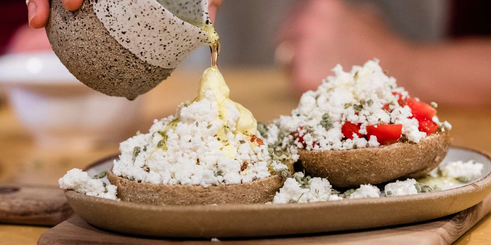 Kretischer Ntakos-Salat: Knusprige Gerstenzwiebackstücke in Olivenöl, gewürfelten Tomaten, Kapern, Oregano und saurem Mizithra-Käse