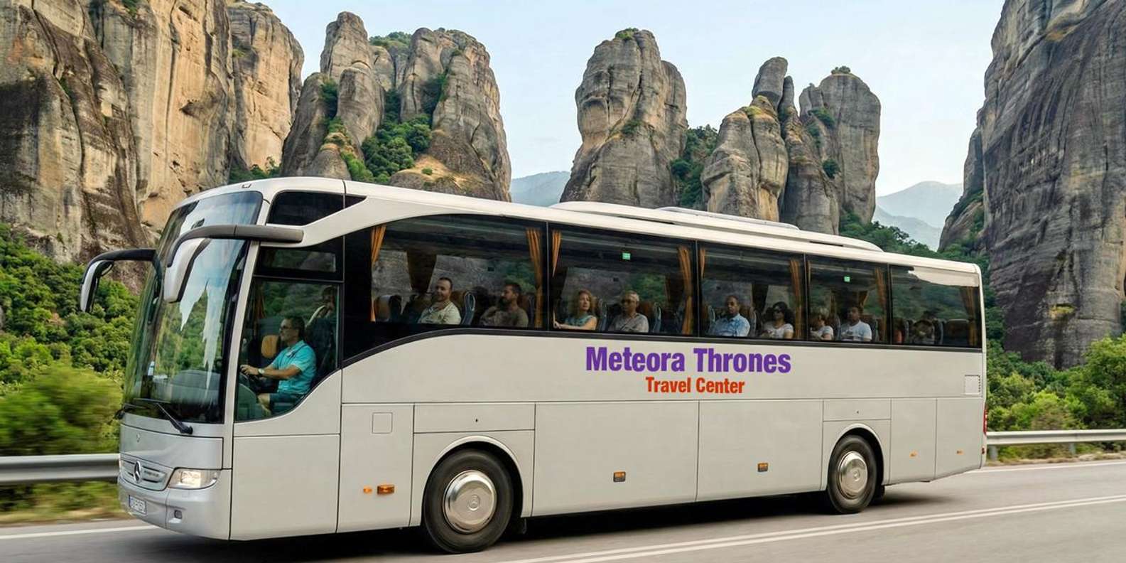 Abfahrt um 08:00 Uhr vom Bahnhof Larissa in Athen mit einem komfortablen, klimatisierten Reisebus, der dich in etwa 4 Stunden in die Stadt Kalabaka bringt.