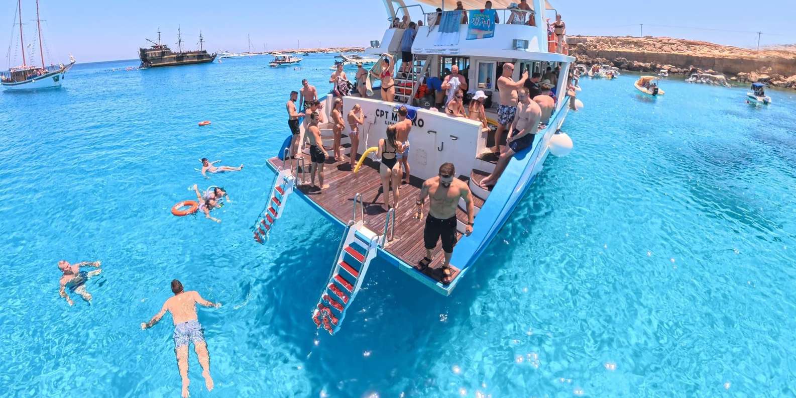 Entdecke das Beste der Küste von Ayia Napa auf einer Kreuzfahrt zur Blauen Lagune. Springe vom Oberdeck, schwimme und schnorchle zwischen Fischen und Meeresschildkröten bei zwei Badestopps.