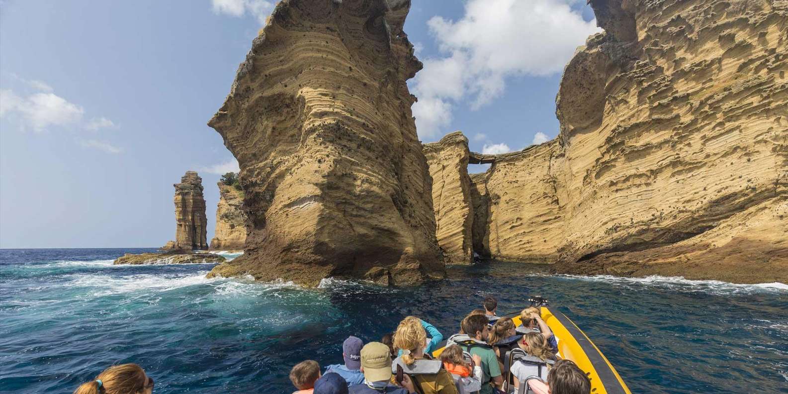 Nach der Rückkehr zum Yachthafen macht das Boot eine Tour um die Insel Vila Franca do Campo, um das vulkanische Wunderwerk und die dort lebenden Wildtiere aus nächster Nähe zu betrachten.