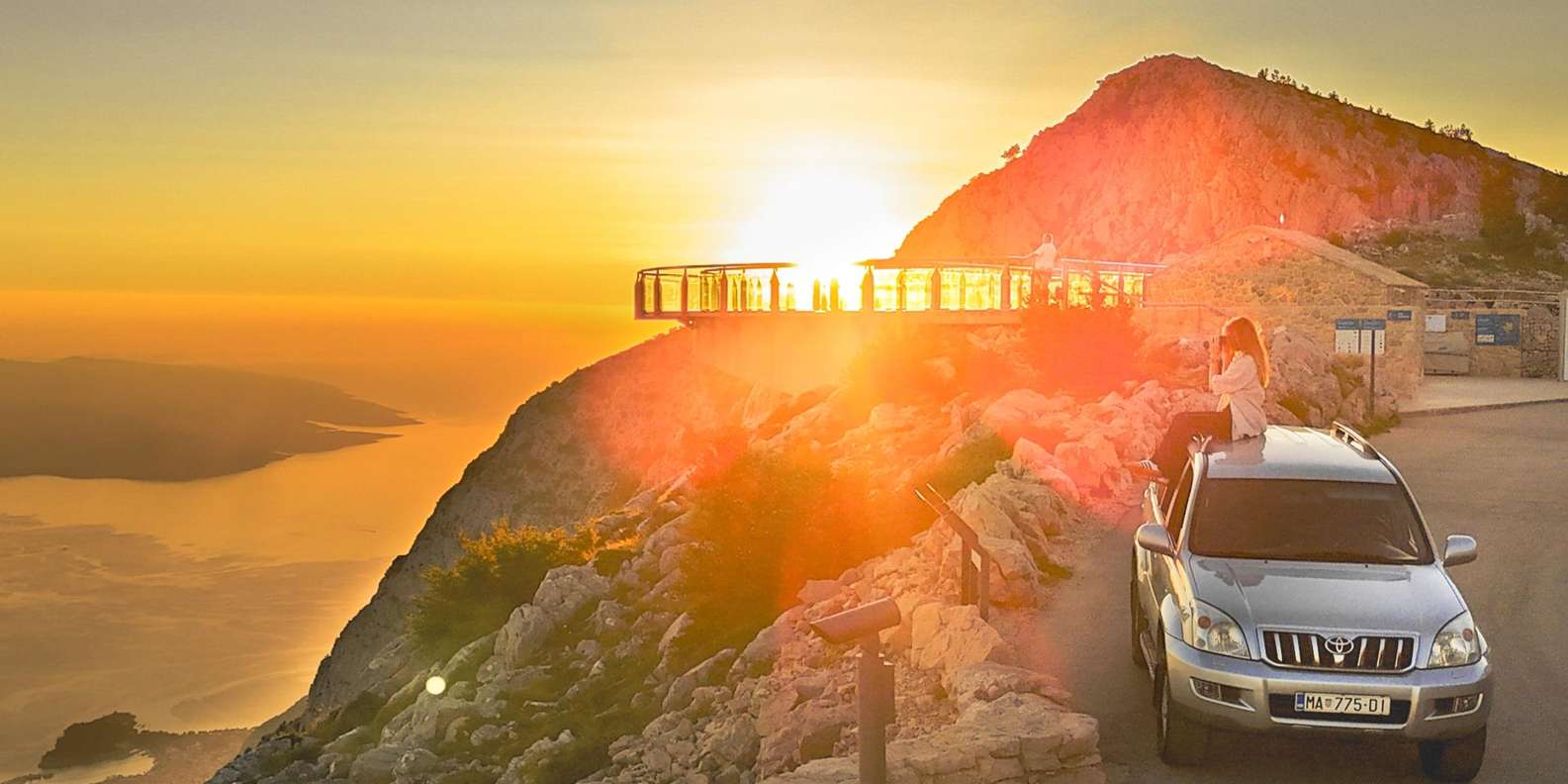 Fahre auf Kroatiens höchstgelegener Straße in einem Geländewagen, betritt den Skywalk und genieße ein Glas Wein auf dem Gipfel Sinjal, umgeben von einer atemberaubenden Aussicht.