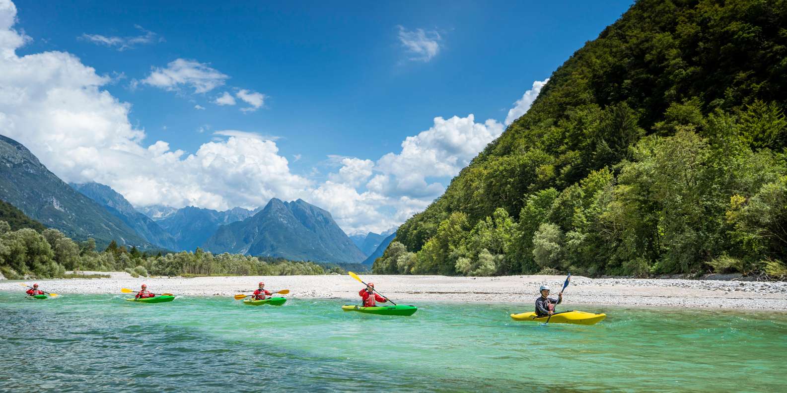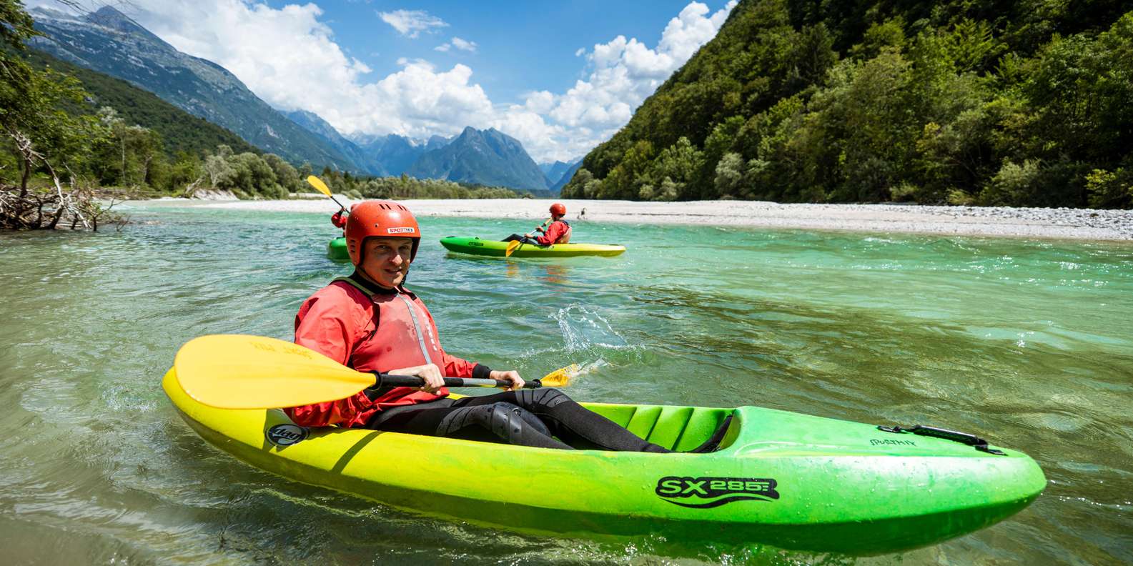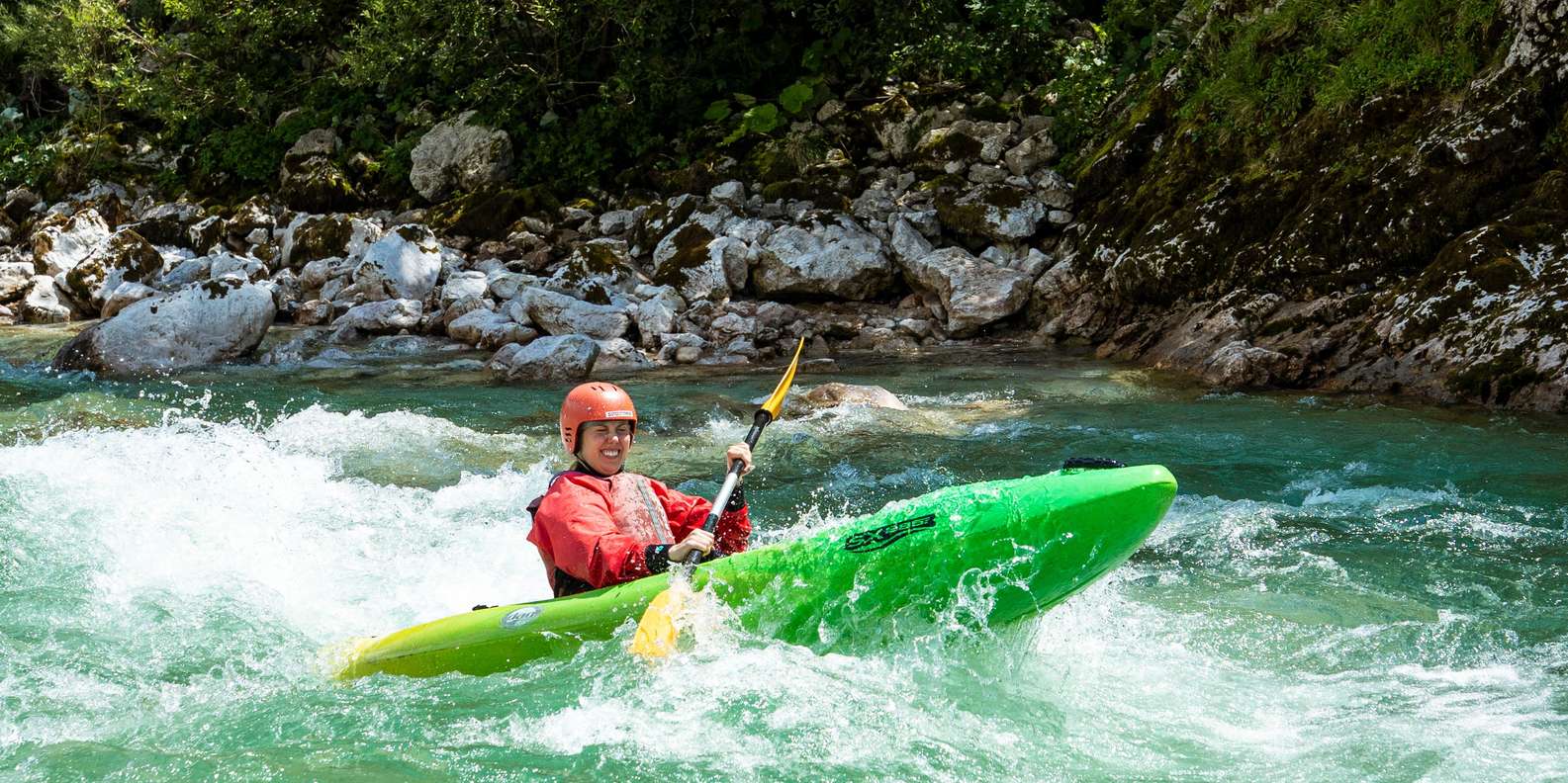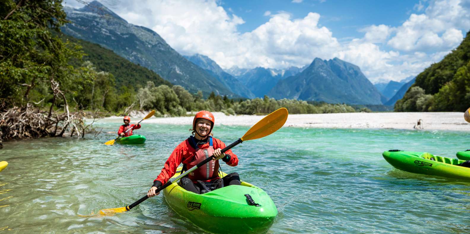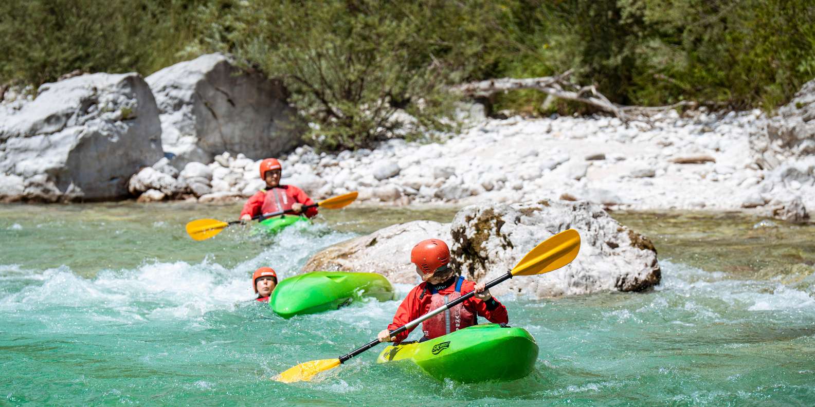 - Entdecke die Schönheit des Soča-Flusses in kleinen Kajakgruppen und navigiere durch Stromschnellen.