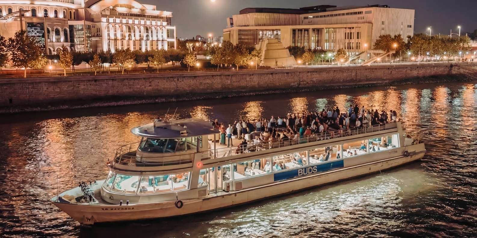 Entdecke Budapest bei Nacht auf einer magischen Dinner-Bootsfahrt auf der Donau, die feines Essen, Live-Unterhaltung und atemberaubende Ausblicke vereint. Gehe an Bord eines komfortablen und wunderschönen Bootes und beginne deinen Abend mit einem Glas Prosecco zur Begrüßung.