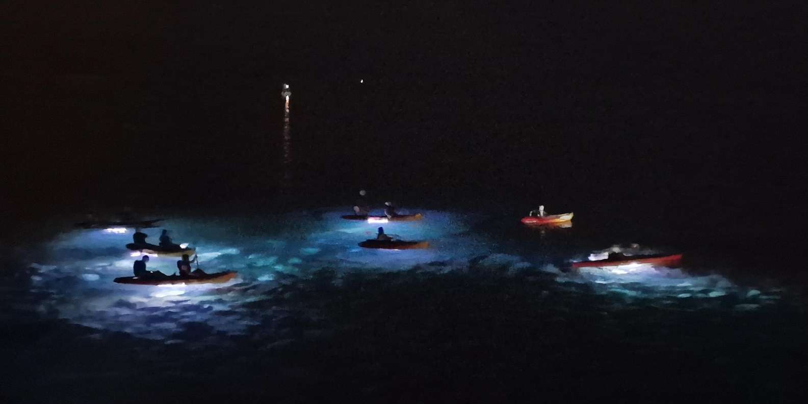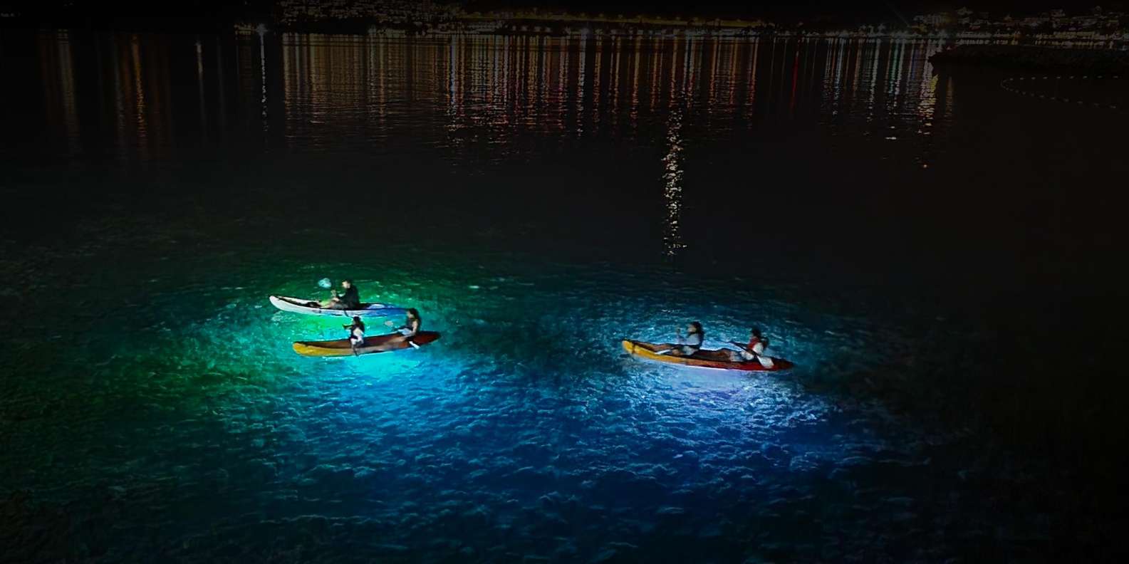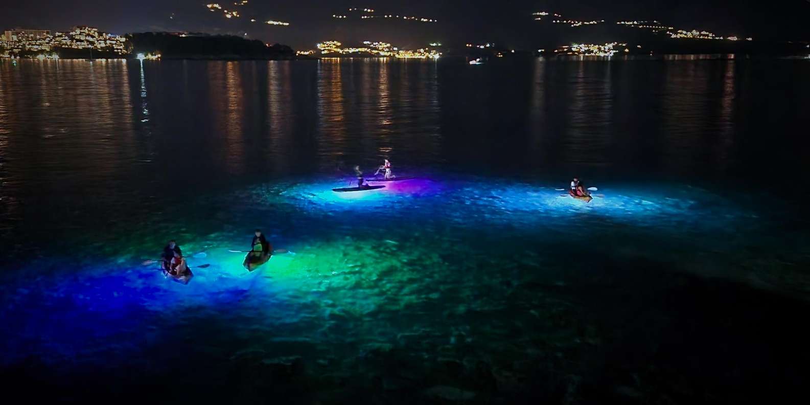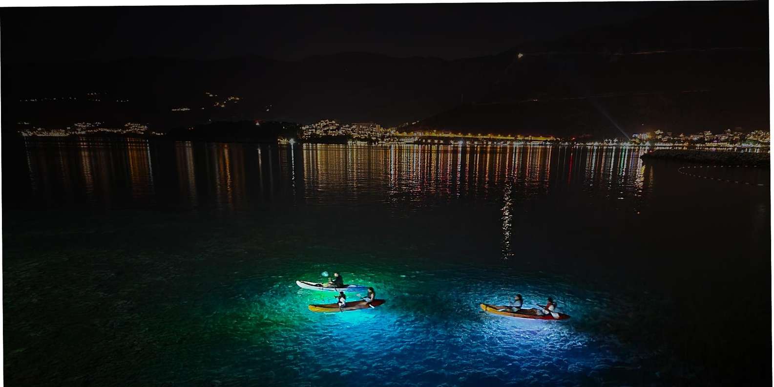 Begib dich auf ein faszinierendes zweistündiges Kajak- oder Stand-up-Paddle-Board-Abenteuer (SUP) und erlebe die Küste buchstäblich in einem ganz neuen Licht. Während LED-Lichter das Wasser unter dir beleuchten, entdeckst du den Zauber des Paddelns unter dem Nachthimmel.