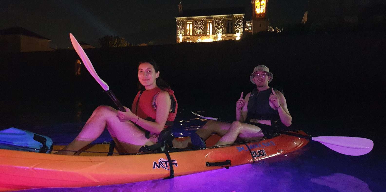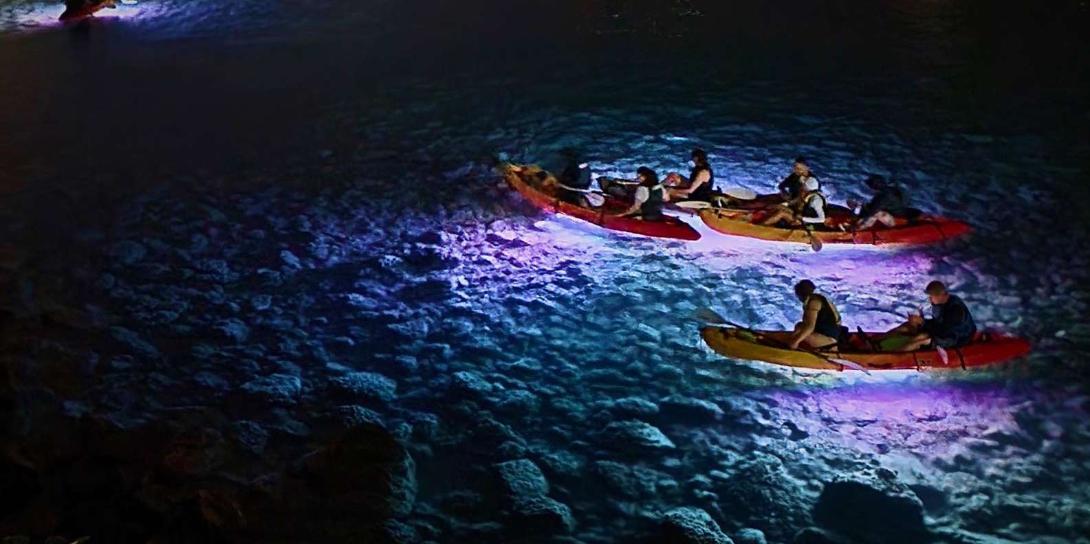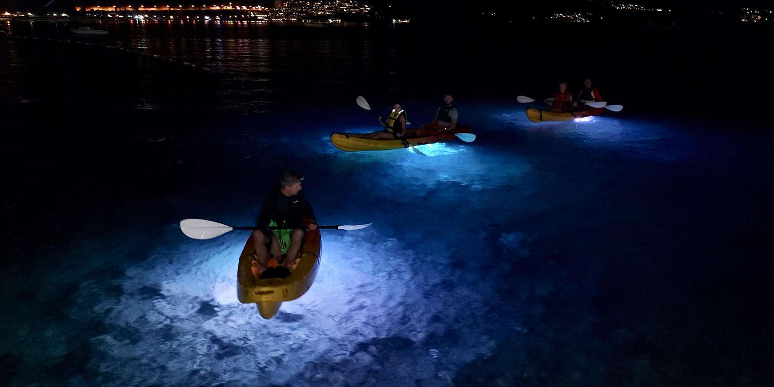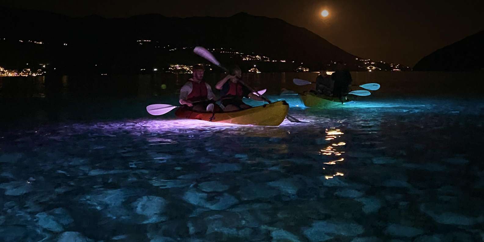 Begib dich auf ein faszinierendes zweistündiges Kajak- oder Stand-up-Paddle-Board-Abenteuer (SUP) und erlebe die Küste buchstäblich in einem ganz neuen Licht. Während LED-Lichter das Wasser unter dir beleuchten, entdeckst du den Zauber des Paddelns unter dem Nachthimmel.