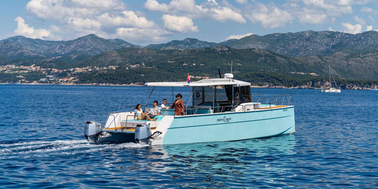 - Stich vom Hafen der Altstadt von Dubrovnik mit einem stilvollen Katamaran in See.
