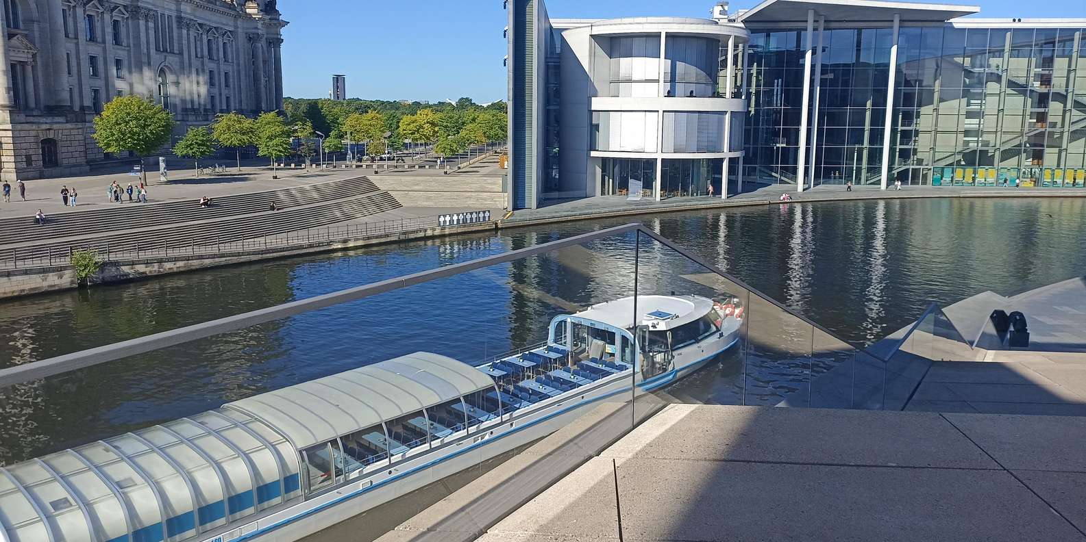 An einem Ort an dem sich in den letzten beiden Jahrhunderten buchstäblich radikale Veränderungen abzeichneten, soll es hier u. a. Antworten auf folgende Fragen geben: Warum steht hier die Schweizerische Botschaft ganz allein? Wie sah es hier während der Deutschen Teilung aus? Wo war die Siegessäule früher? Was plante man hier in der Nazidiktatur? Wo ist das Kanzlerbüro und wie kommt man von dort ins Reichstagsgebäude? Unser folgender Spaziergang führt entlang der wichtigsten Bauten des Parlaments. Sie schauen auf und in jene Orte an denen im Bundestag Gesetze entstehen. Und erfahren dabei: wie das Parlament arbeitet, was der Berliner unter einer "Höheren Beamtenlaufbahn" versteht, wo die Sommerinterviews mit Spitzenpolitikern stattfinden und wozu Abgeordnete den Wissenschaftlichen Dienst benötigen. Sie flanieren über die Spree und entlang der Uferpromenade und überwinden dabei den Horizont der ehemaligen Berliner Mauer gleich zweifach. Nach dem Spaziergang führen wir Sie ins Reichstagsgebaäude bis zum Plenarsaal.