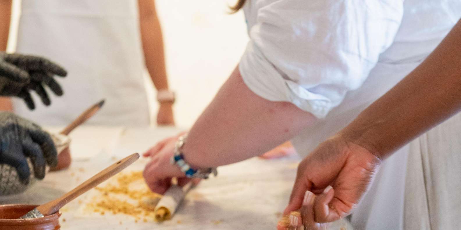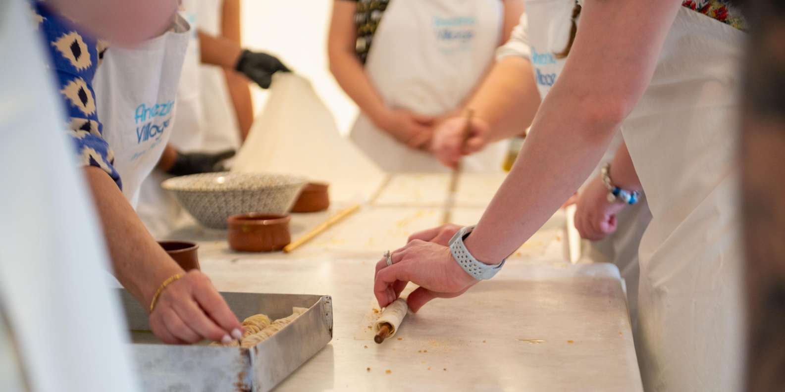 Das Erlebnis beginnt mit einem Begrüßungsaperitif, bei dem du griechischen Wein und Souma (einen traditionellen Likör aus den Resten des Weinherstellungsprozesses) trinken kannst, während du die reiche Geschichte hinter den Gerichten erfährst, die du zubereiten wirst.