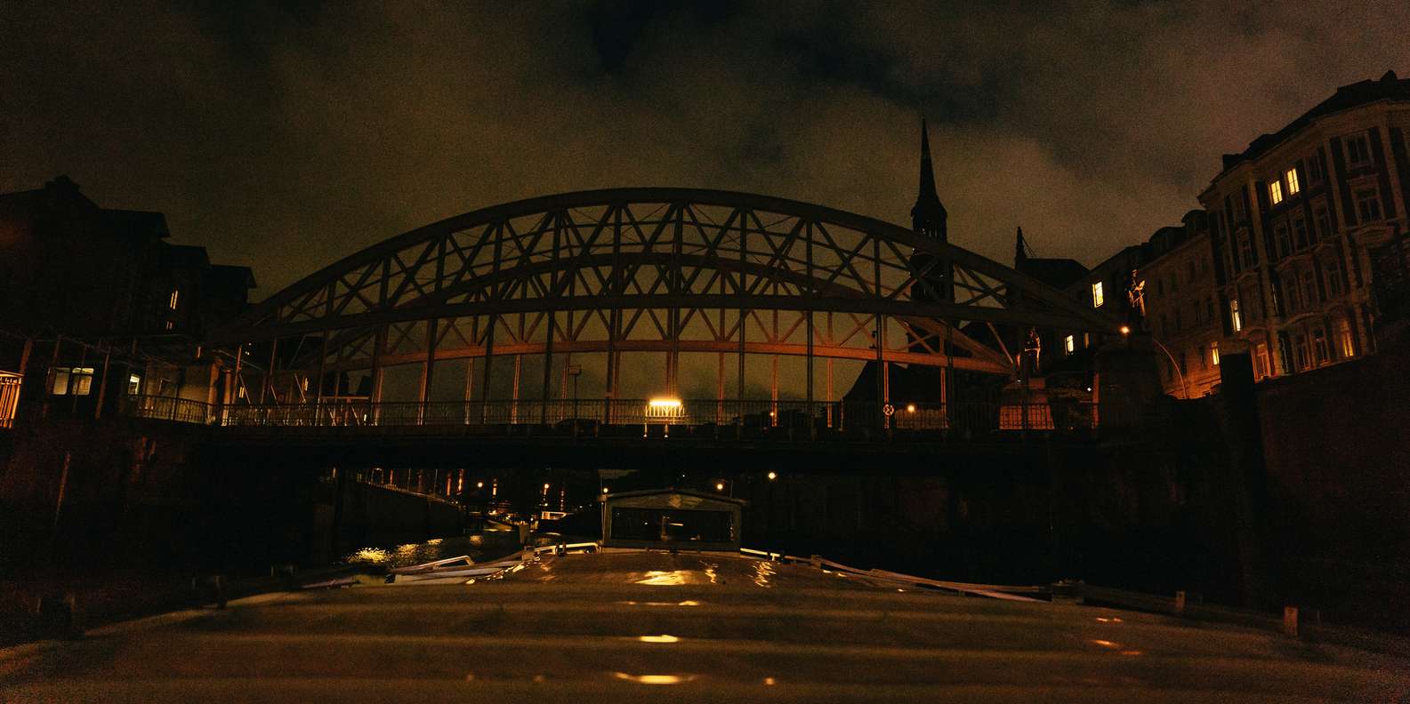 Gehe auf eine abendliche Tour auf einem traditionellen Kahn und fahre durch den beleuchteten Hamburger Hafen. Bewundere die romantischen Lichter und Sehenswürdigkeiten der Stadt vom glitzernden Wasser aus.