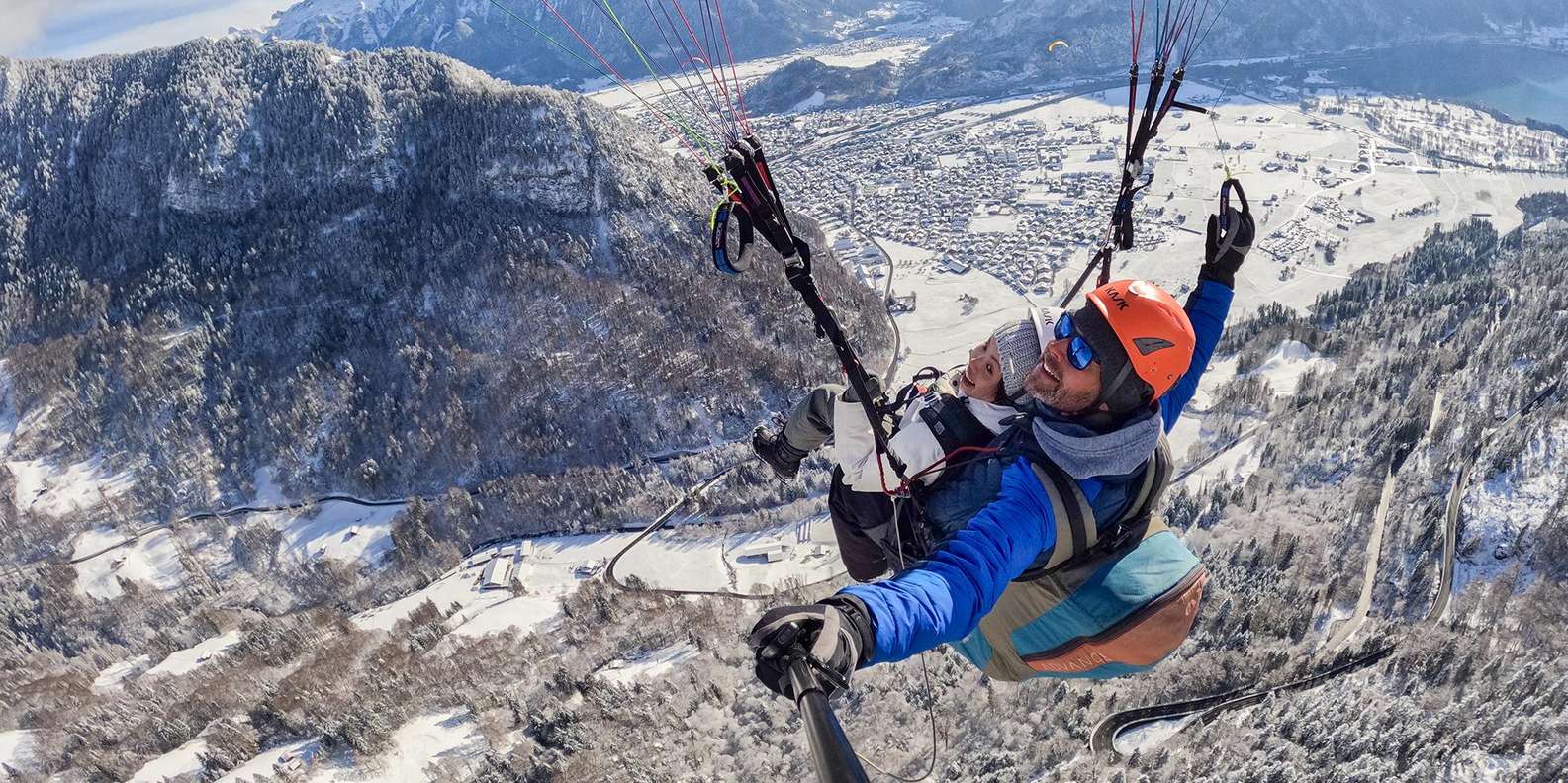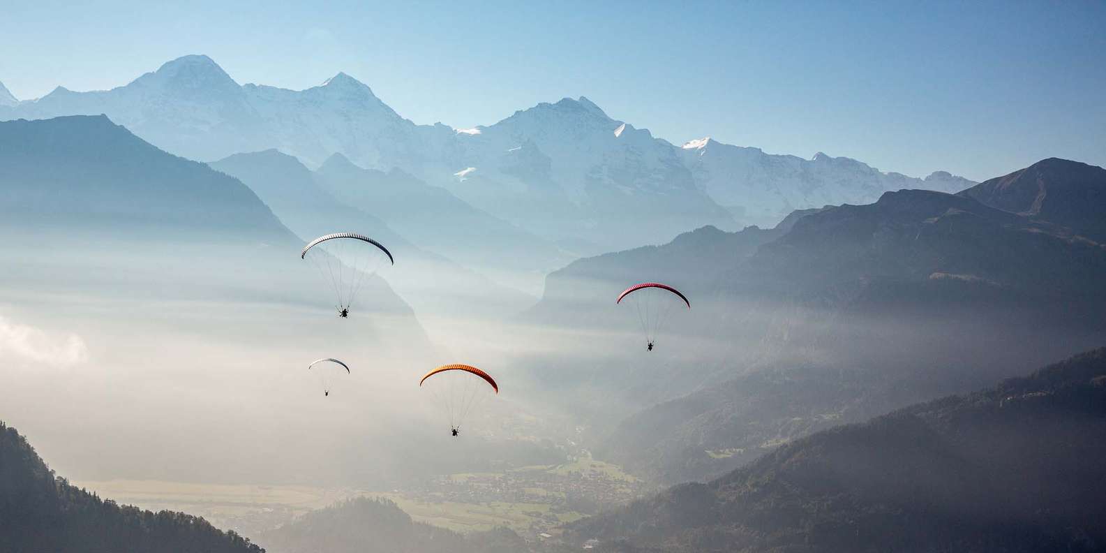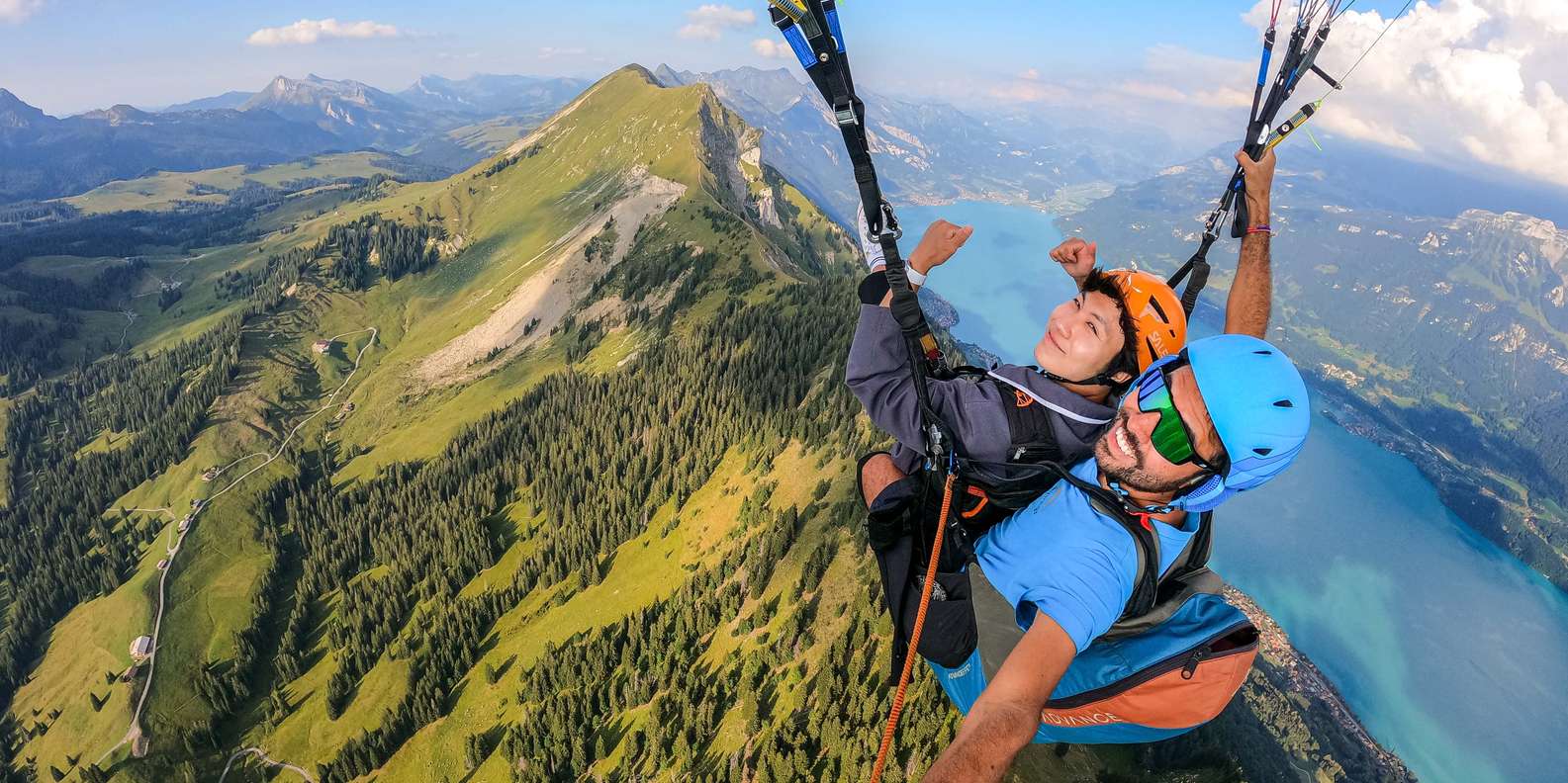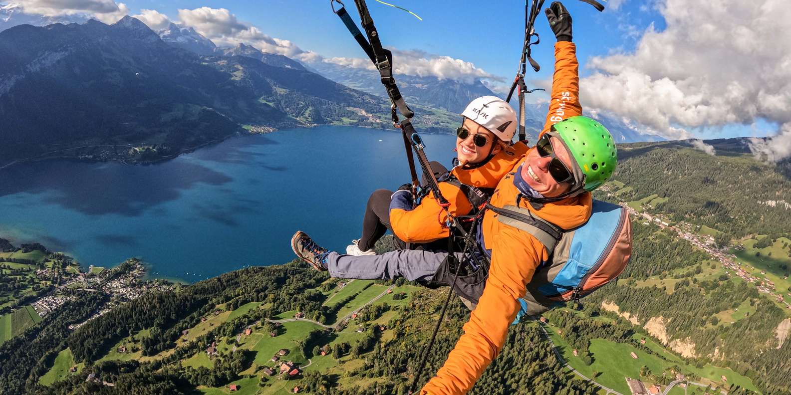 Flieg beim Paragliding in luftige Höhen und genieß die spektakuläre Aussicht auf Berge und Seen. Entdecke Interlaken von oben bei einem Tandemflug mit einem erfahrenen Piloten