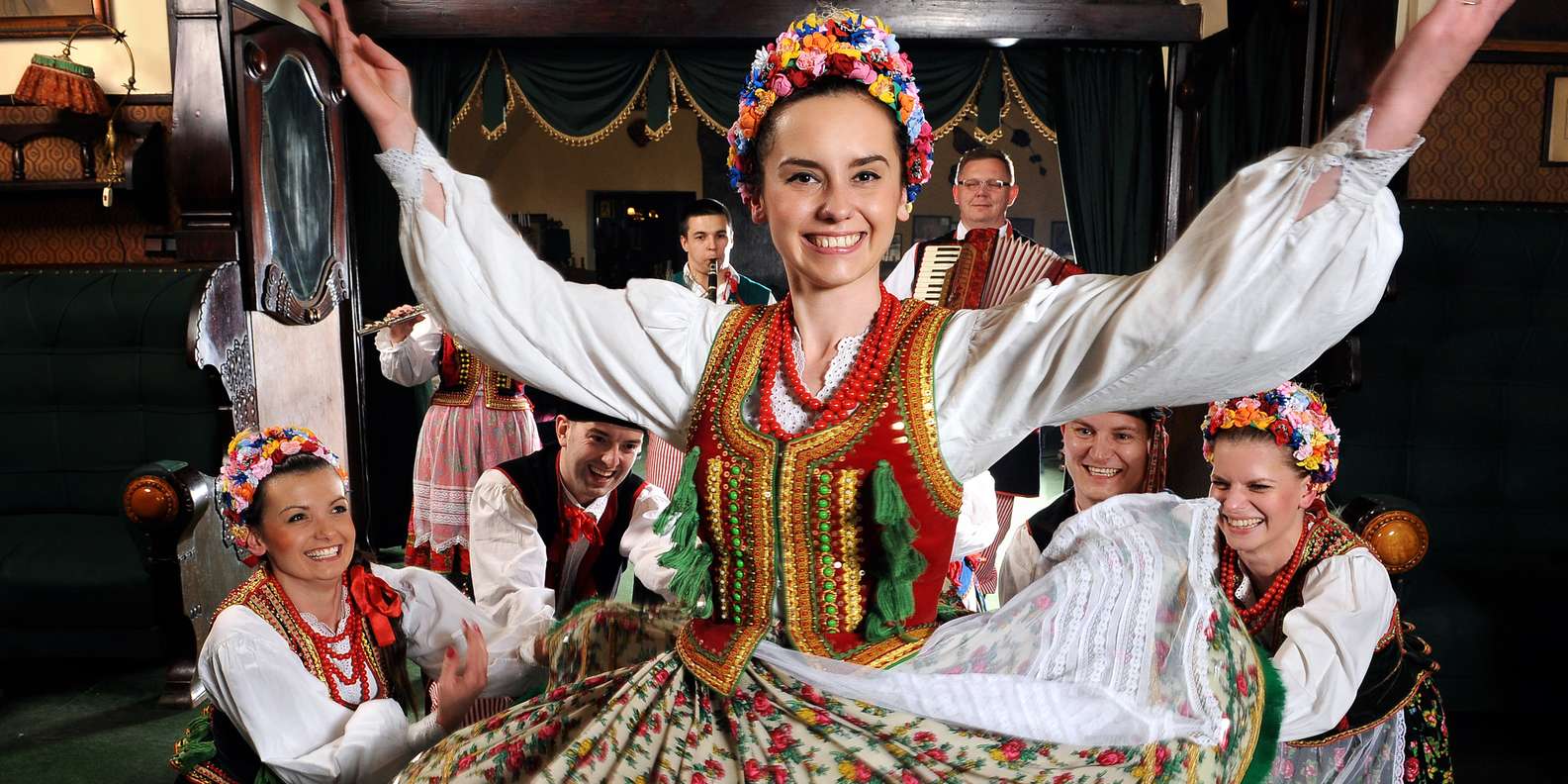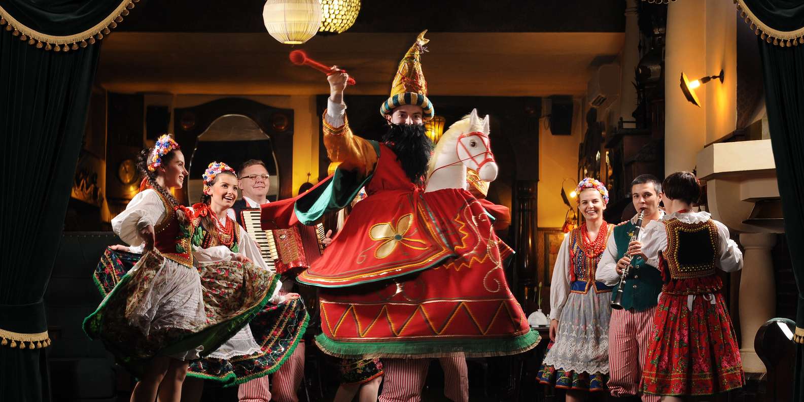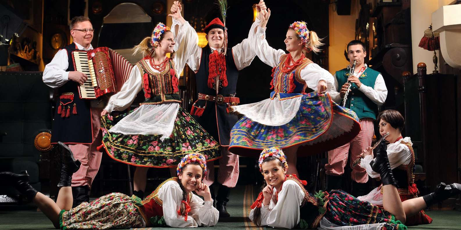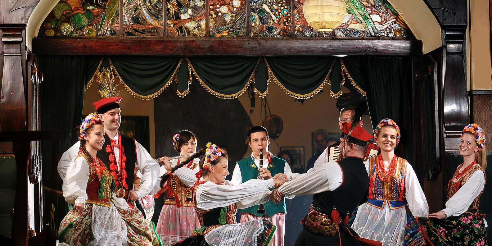 Entspanne dich, während das Konzert und die Tanzvorführung beginnen. Erfahre mehr über polnische Traditionen und Folklore, während du zusiehst, wie Darsteller in regionalen Trachten ihre Geschichten durch Tanz und Volksmusik erzählen.