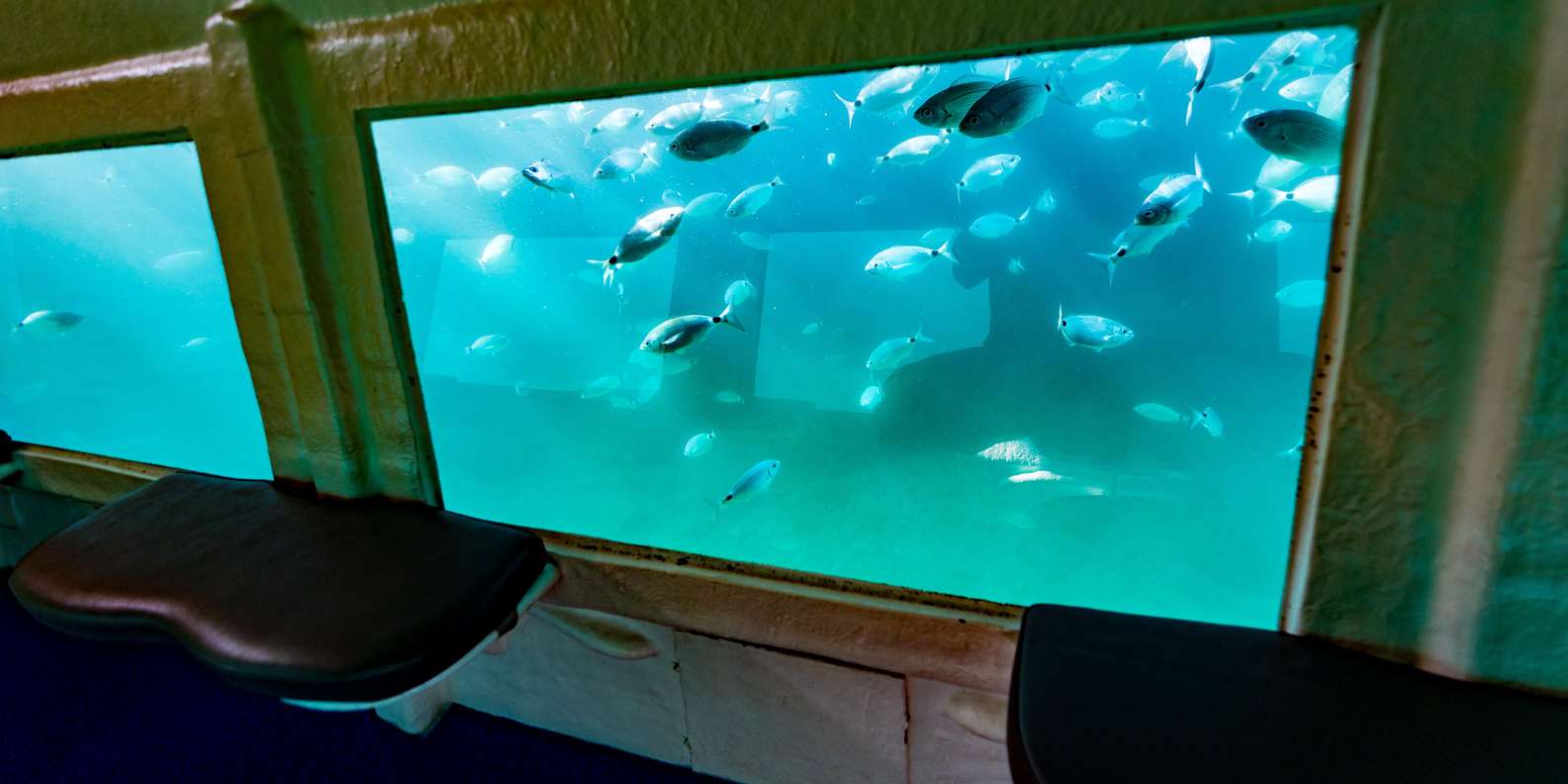 Steig an Bord des Halb-U-Boots, das nicht taucht, sondern eine Kabine hat, die 1,5 Meter unter der Meeresoberfläche liegt. Der andere Teil des Bootes bleibt über Wasser. Die Unterwasserkabine hat auf jeder Seite 4 Fenster aus gehärtetem Glas und ist mit einer Klimaanlage ausgestattet, die an heißen Sommertagen und -abenden für angenehme Erfrischung sorgt.