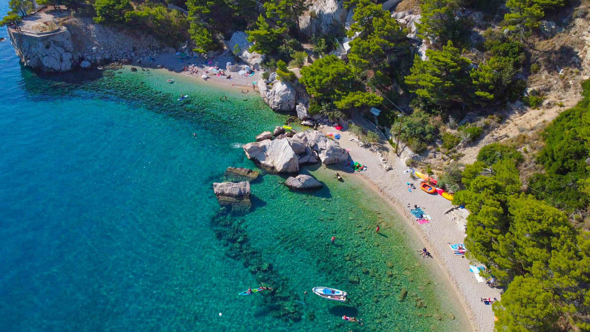 Luftaufnahme von den vielen kleinen Badeabschnitten am Strand Kajak, der am nördlichen Ortsrand liegt. (Foto: Tz Omiš; visitomis.hr)