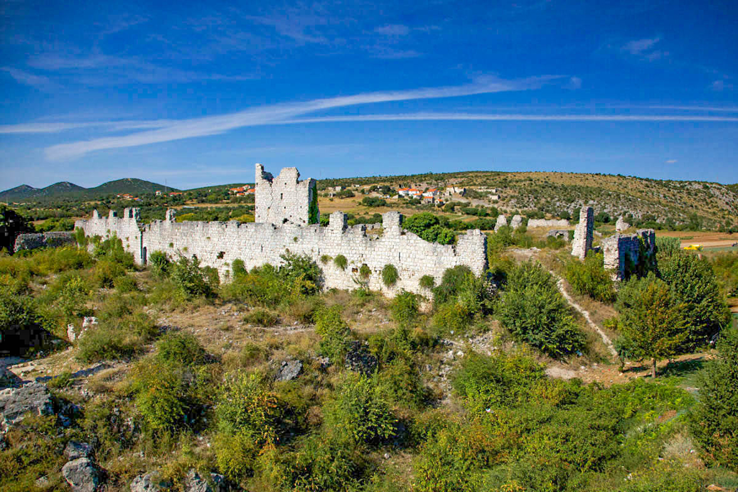Die Ruinen der Festungsanlage von Stari grad Vrana, aus dem 12. Jh., liegen ca. 7 km nordöstlich von Pakostane auf einem Hügel. (Foto: Tz Pakostane; pakostane.hr)
