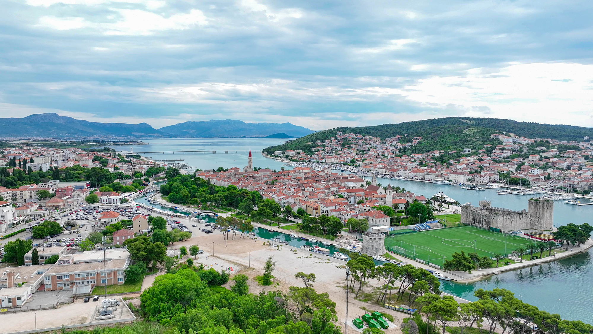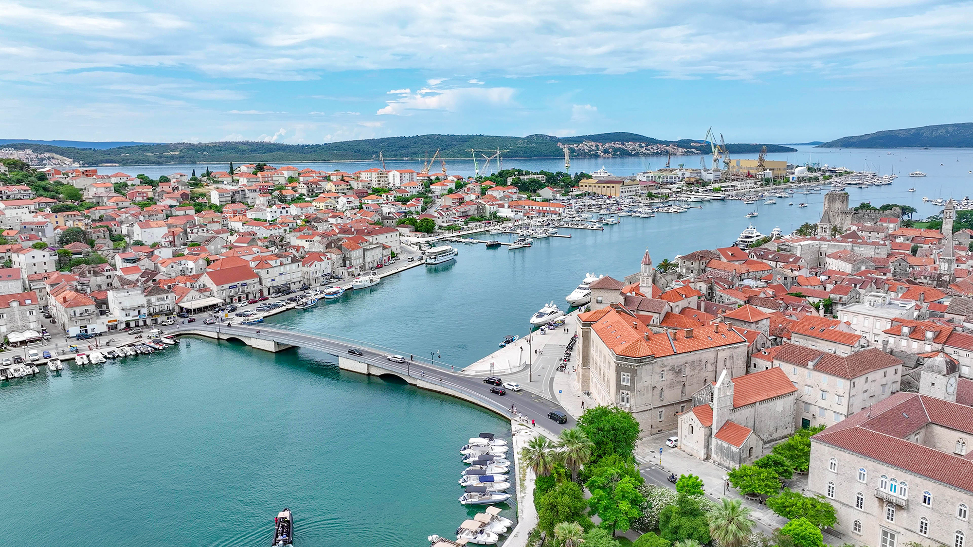 Luftaufnahme von der Altstadt-Insel von Trogir - Im Hintergrund die Insel Ciovo
