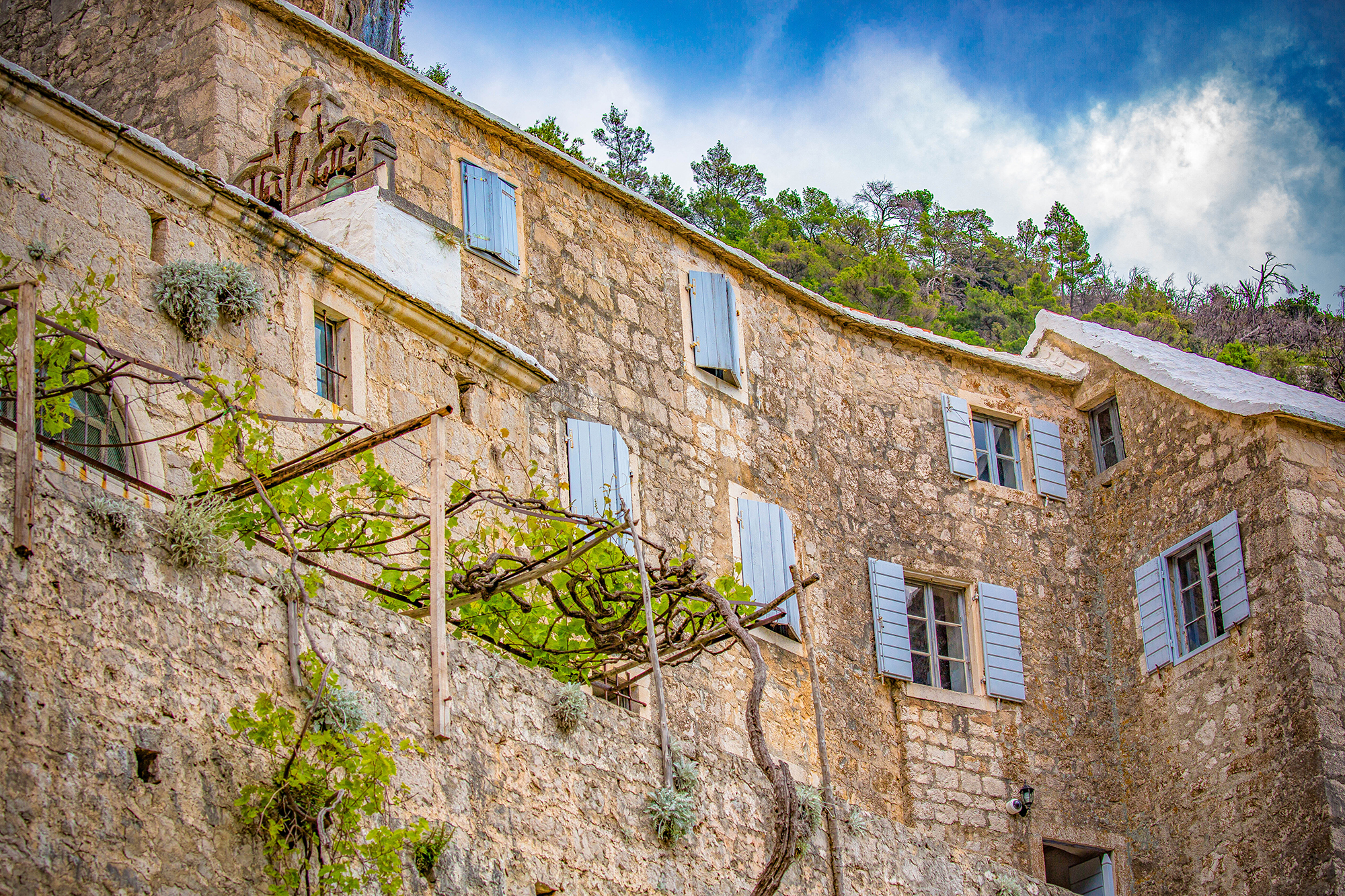 Der, an einen steilen Felsen gebaute, Klosterkomplex, mit seinen terrassenförmig angelegten Steingebäuden, zeigt eine einzigartige, traditionelle, dalmatinische Architektur. Die Menschen haben sich geschickt an die natürliche Umgebung angepasst und Häuser, eine Kirche, Wirtschaftsgebäude und Lagerräume aus lokalem Stein gehauen und in der Einöde erbaut. Die steinernen Gebäude, verschmelzen mit der Felswand und erzählen stumm von einem Leben voller Gebet, Arbeit und dem Streben nach Einfachheit. Die schlichte und funktionale Bauweise, sind ein wahres Meisterwerk der Planung und Handwerkskunst.