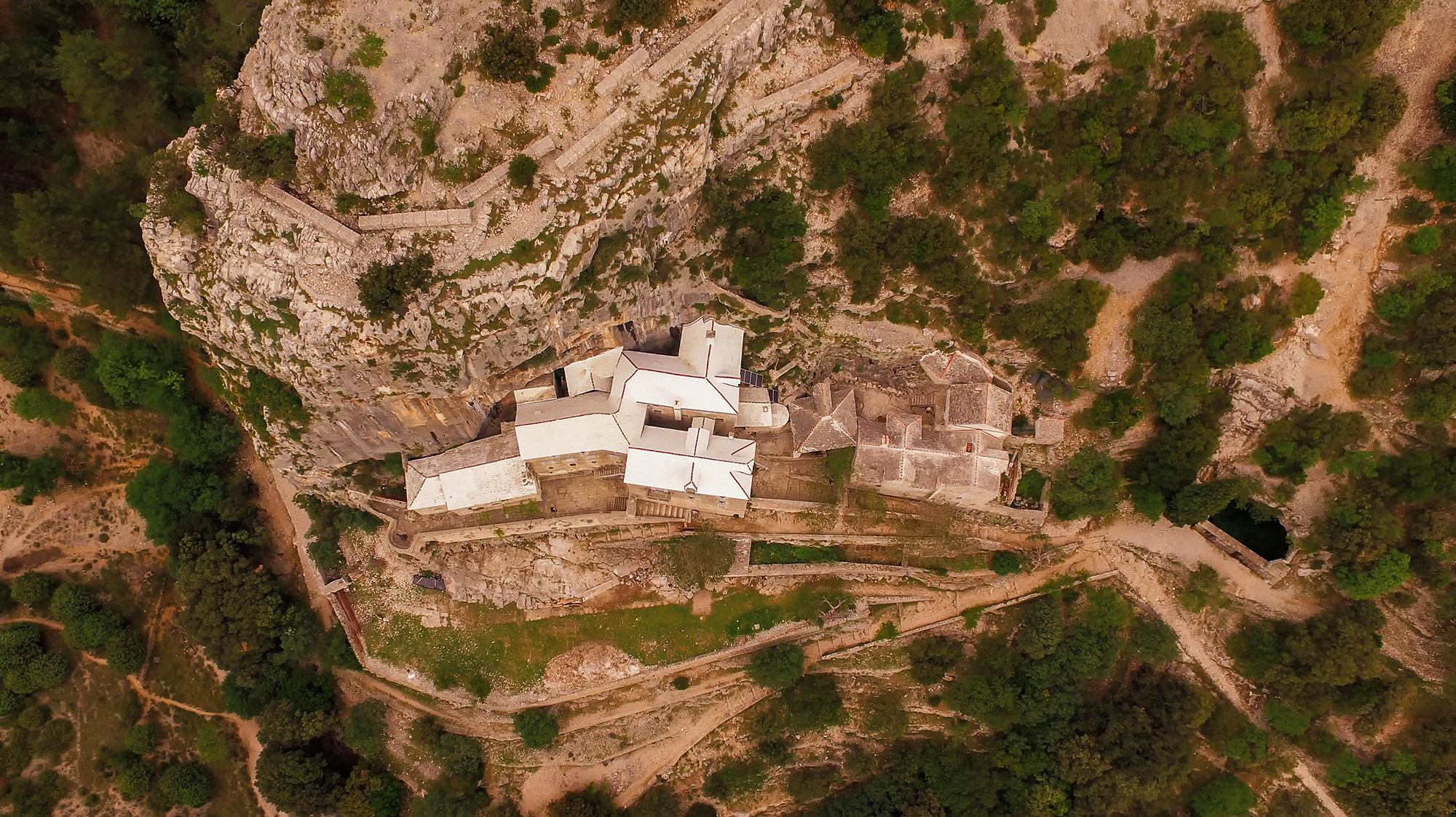 Das Kloster, auch „Eremitage“ genannt, was übersetzt „Einsiedelei“ bedeutet, liegt verborgen in einer tiefen Schlucht, etwas weiter im Insel-Inneren. Der einzigartige, historische Klosterkomplex, wurde einst in eine steile Felswand gebaut und schmiegt sich nahtlos, fast unsichtbar und gut geschützt, in die Hänge des Tals und der Umgebung ein und ist vom Meer aus nicht zu erkennen.