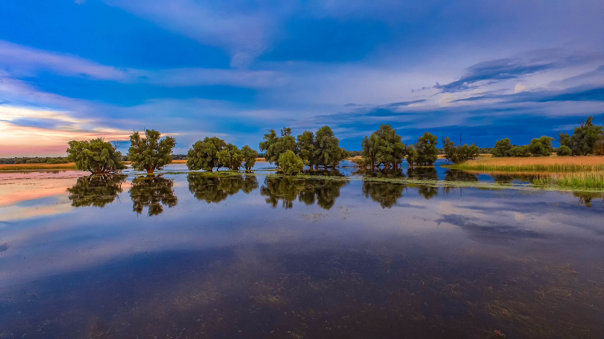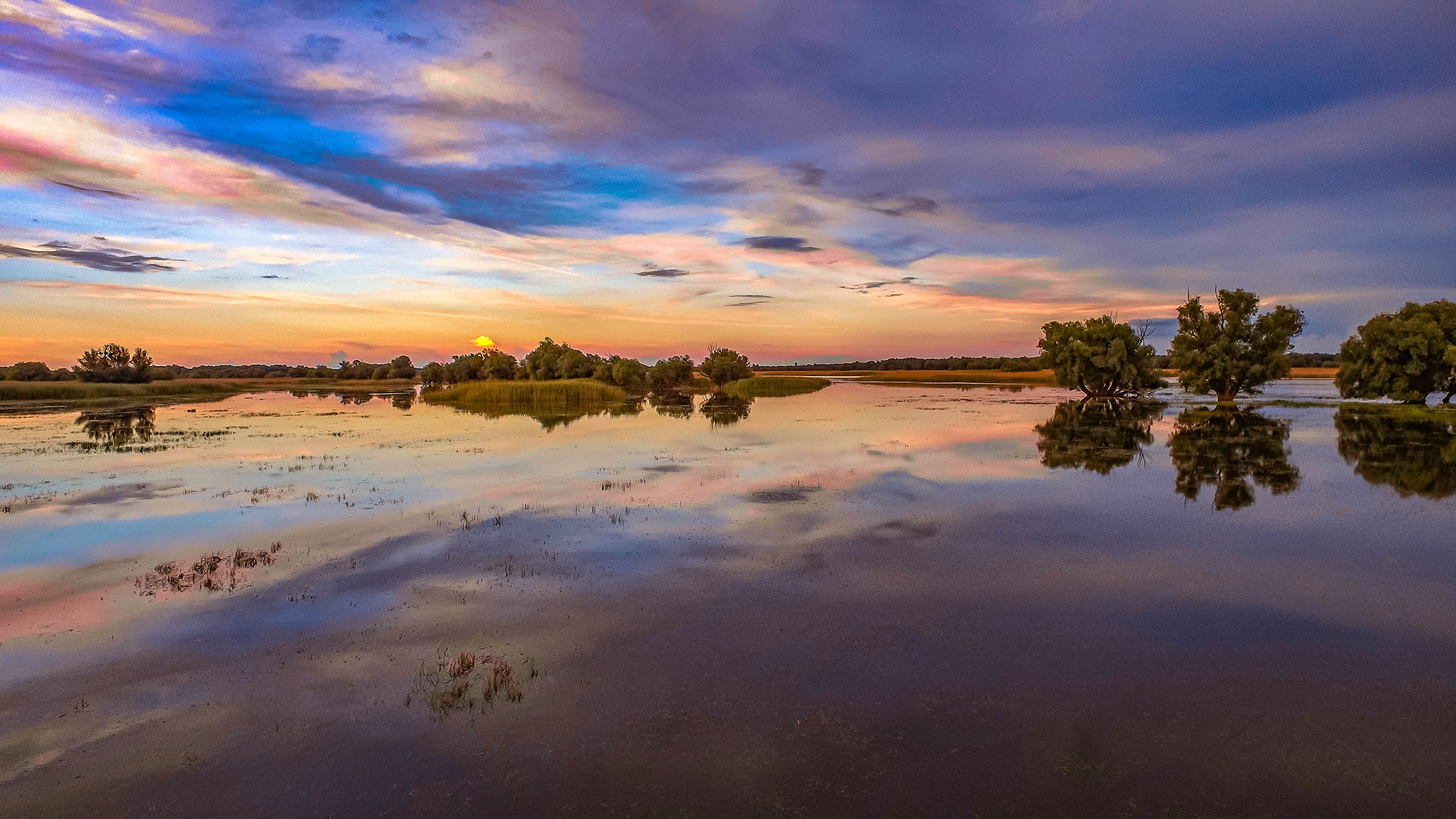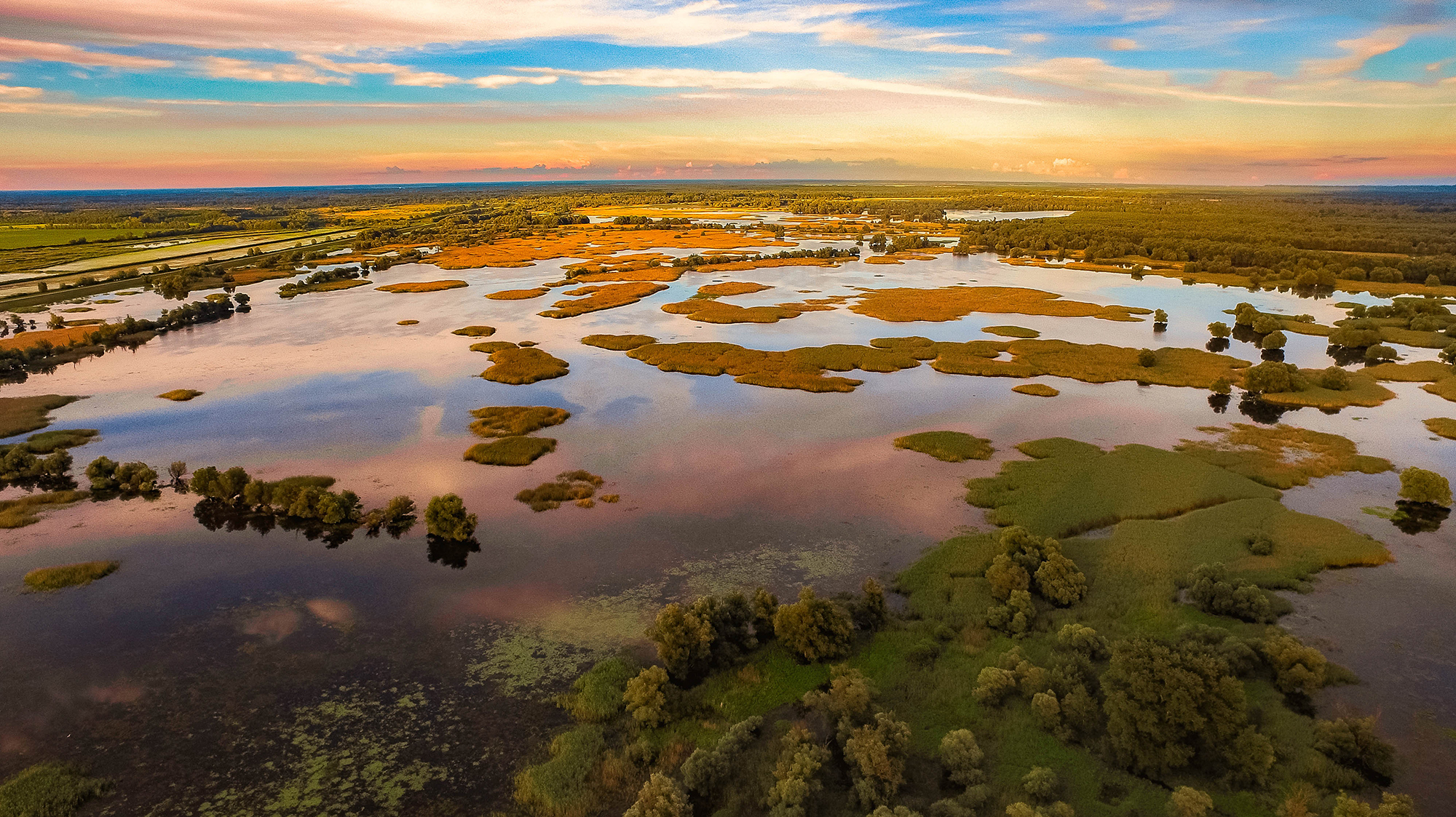 Farbenspiel beim Sonnenuntergang über dem See im Naturpark Kopacki rit in Kroatien. (Foto: Naturpark Kopacki rit; Hrvoje Domazetovic)