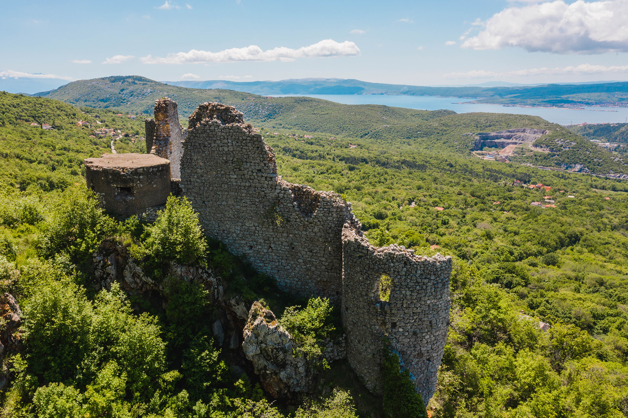 Die Ruinen der Festung von Grižane erhebt sich spektakulär auf den felsigen Klippen – den „griža“ – über dem gleichnamigen Ort. Die einst mächtige und bedeutende Burg war als unregelmäßiges Viereck angelegt und galt als bedeutender Sitz der Familie Frankopan. Ein starkes Erdbeben im Jahr 1323 verursachte schwere Schäden an den Mauern, doch die Überreste zeugen noch heute von der Wehrhaftigkeit der Anlage. Von den Ruinen eröffnet sich ein beeindruckender Ausblick auf das Vinodol-Tal und die umliegende Landschaft.