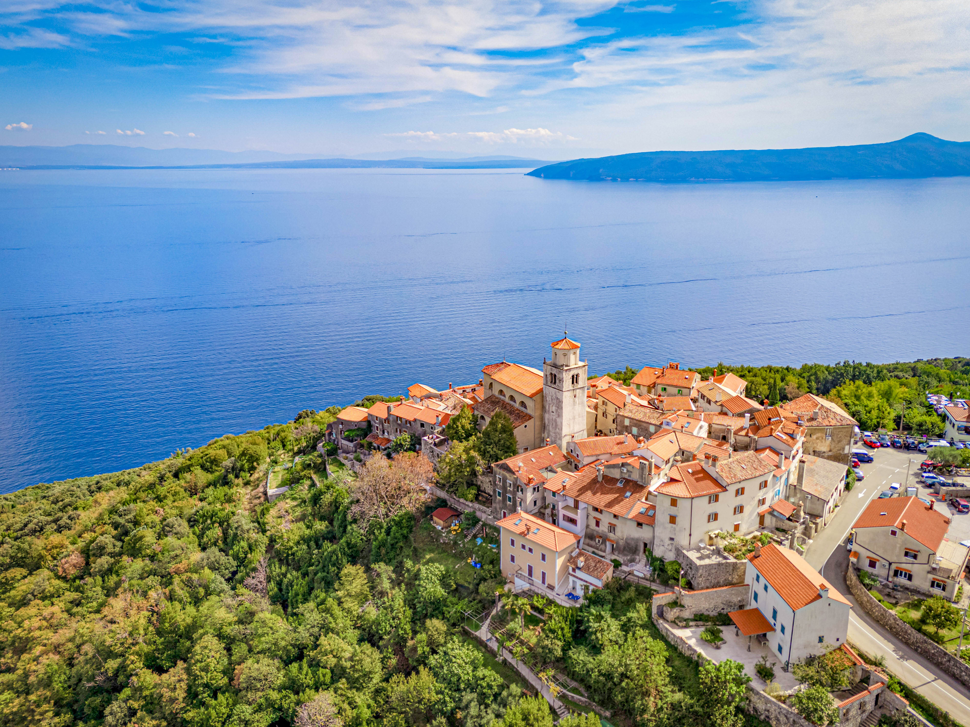 Luftaufnahme der sehenswerten kleinen Ortschaft Mošćenice, die hoch über dem Meer an der Opatija Riviera thront. (Foto: Moscenice.com; Studio11)