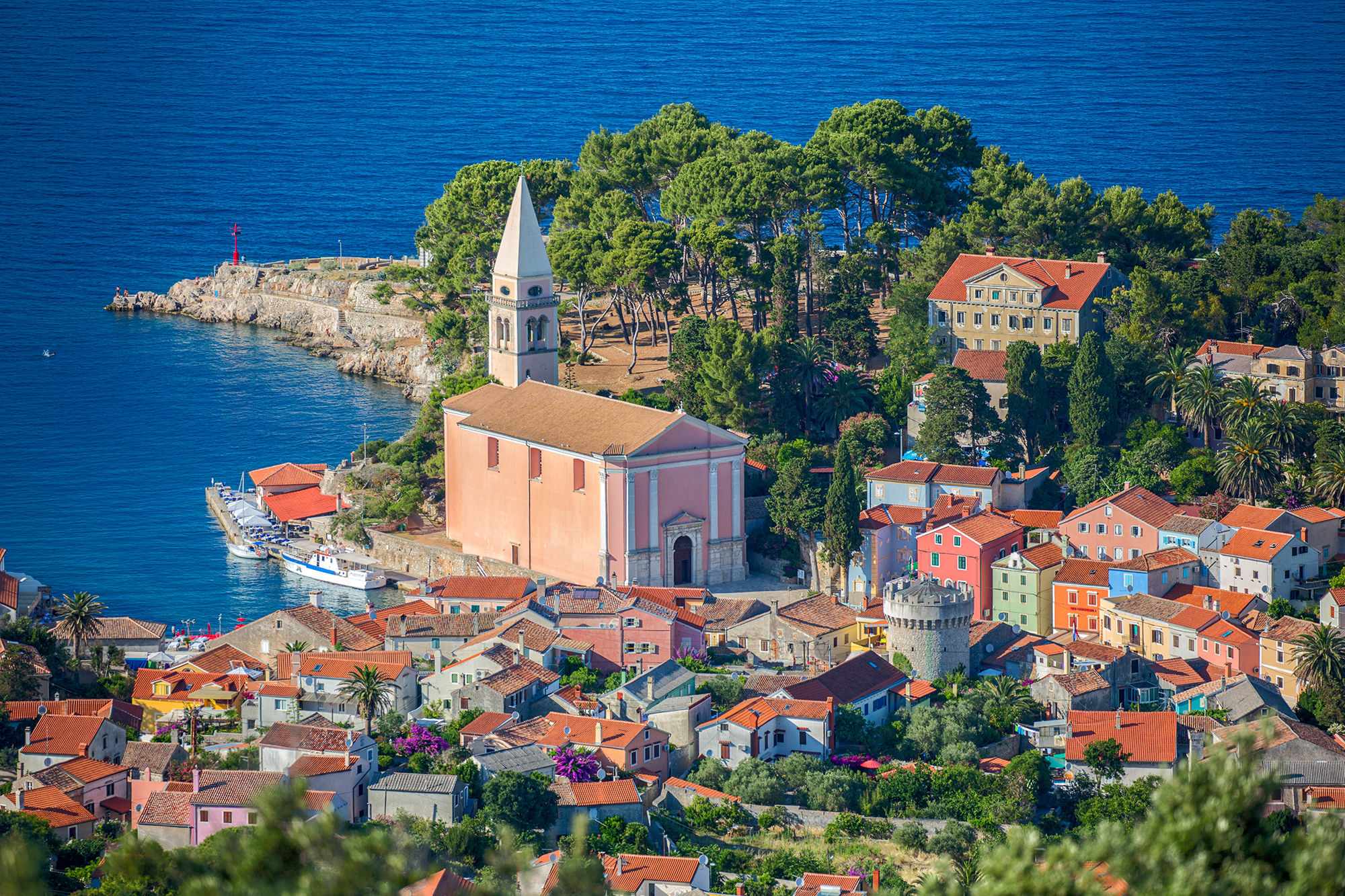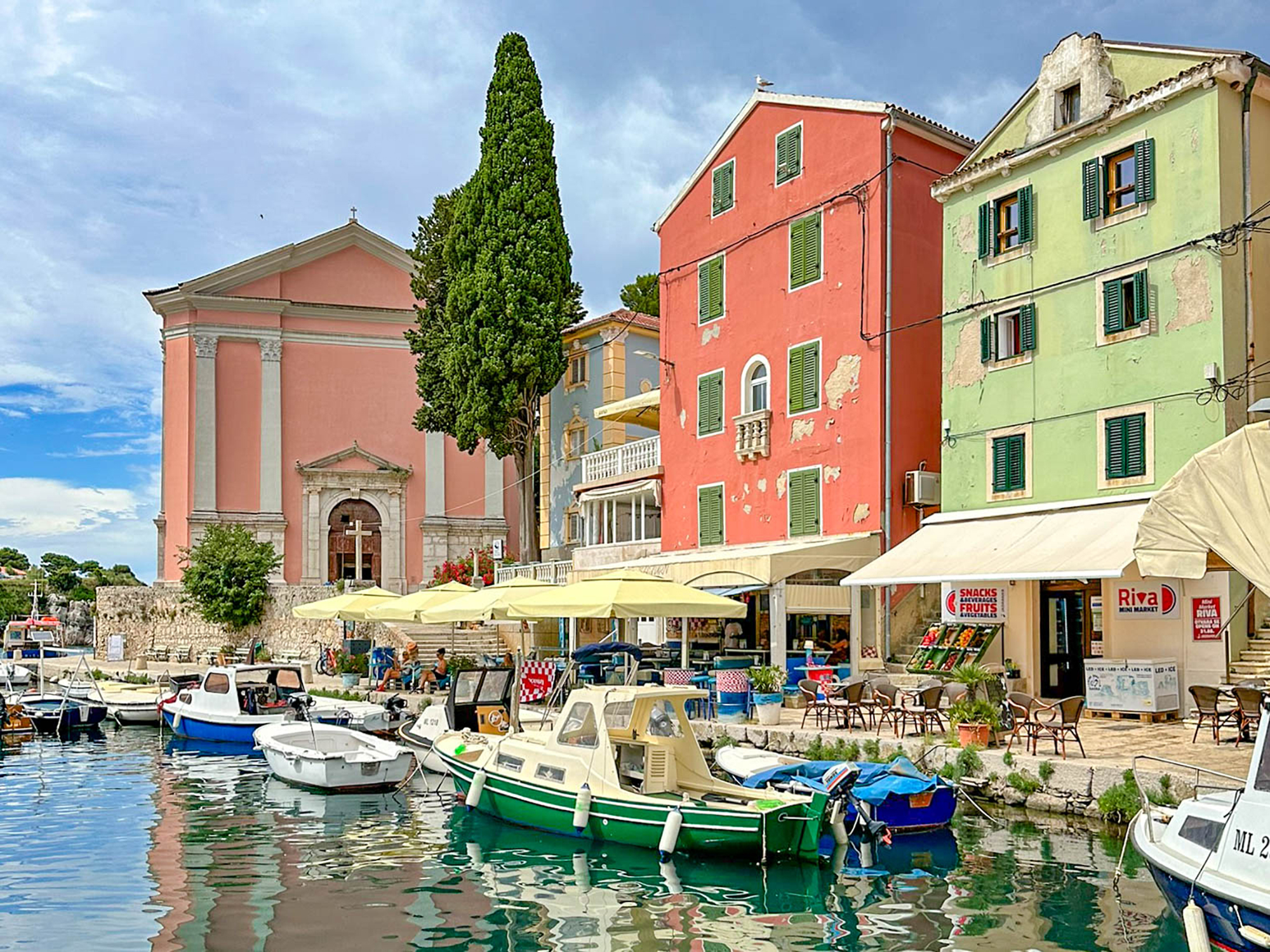 Im pittoresk wirkenden Städtchen Veli Lošinj bildet der Hafen das pulsierende Herzstück der Stadt. Über eine malerische Gasse gelangt man vom Platz vor der Kirche Gospe od Andela hinab in den Altort. Im Ortskern rahmen bunte Häuserfassaden den Hafen und die Bucht ein, in der viele kleine, bunte Boote liegen. Die schmalen Gassen und die historischen Fassaden prägen das authentische Erscheinungsbild von Veli Losinj, während ein wuchtiger Verteidigungsturm aus dem 15. Jahrhundert über die lebhafte Szenerie wacht.