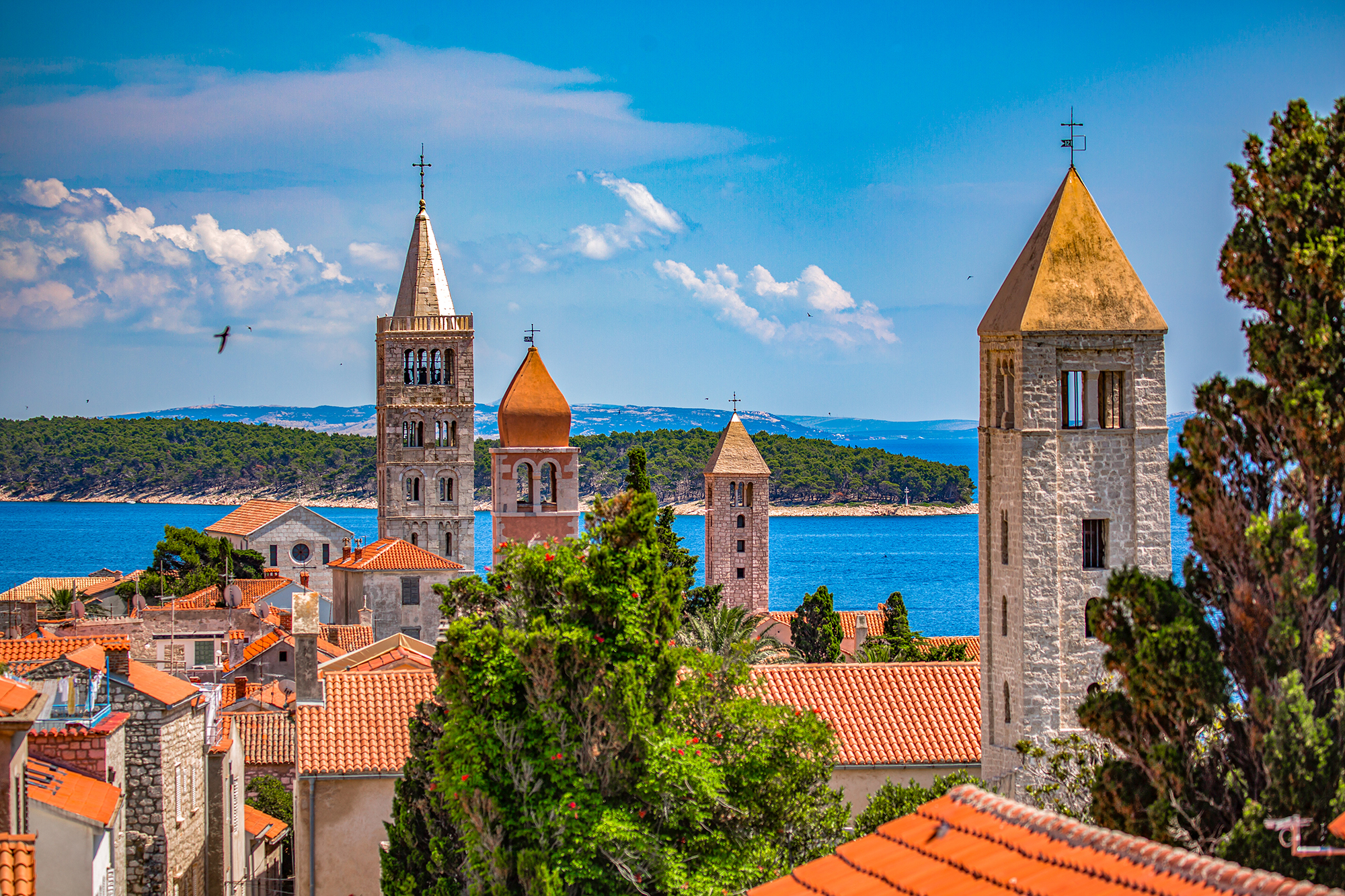Die vier charakteristischen Glockentürmen der Stadt Rab, zählen zu einer der vielen architektonischen Sehenswürdigkeiten der Insel Rab. (Foto: Croatia.hr; Ivo Biocina)
