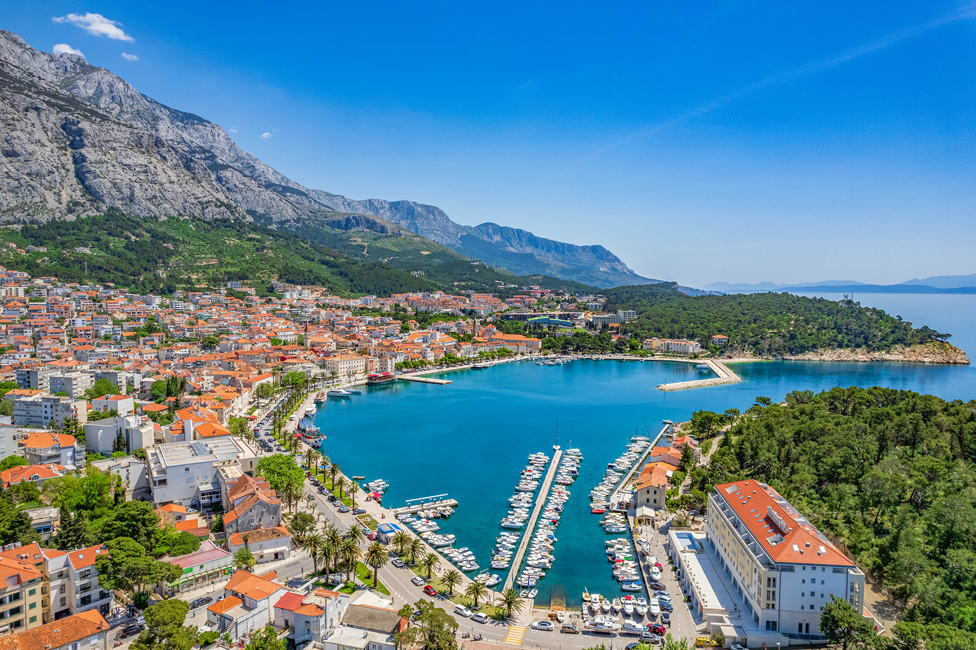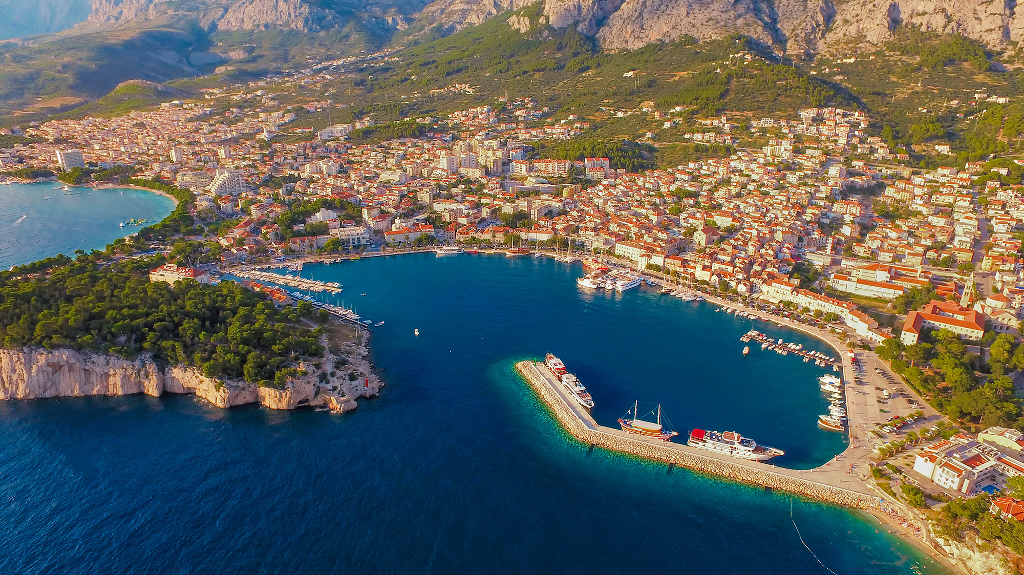 Panoramablick über Makarska, den Stadthafen, rechts die Halbinsel Sv. Petar und im Hintergrund die Halbinsel Osejava. (Foto: TZG Makarska; L33T digital agency; makarska-info.hr)