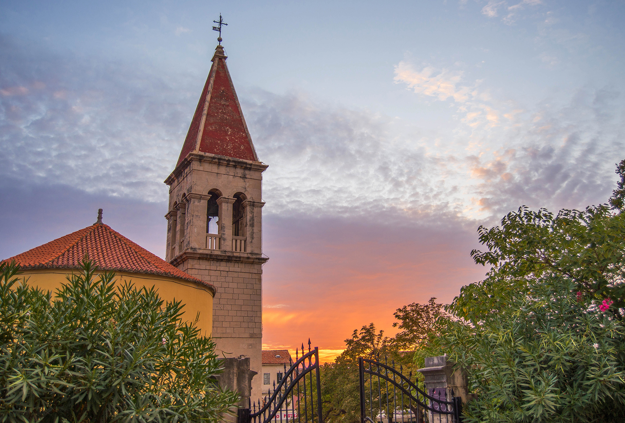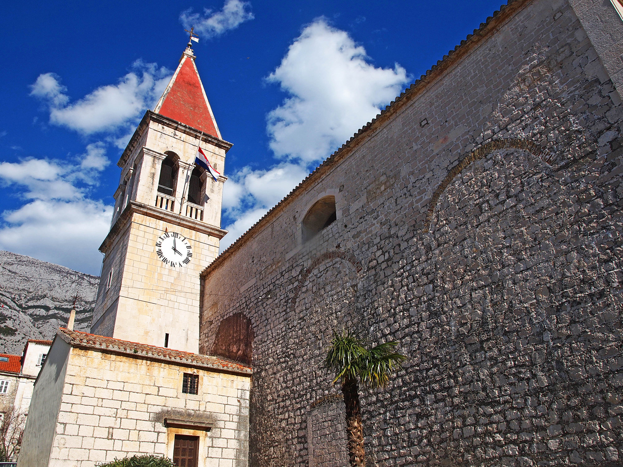 Die barocke Kathedrale Sveti Marka thront an der Nordseite des Kačićev Trg und prägt das Stadtbild mit ihrem markanten Glockenturm, der aus allen Ecken sichtbar ragt. Sie stammt aus dem 18. Jahrhundert und birgt einen prächtigen venezianischen Marmoraltar sowie lebensgroße Kreuzweg-Statuen, die aus den römischen Katakomben des Heiligen Clemens stammen. Der kleine Seitenaltar gegen die Pest und der silberbeschlagene Rosenkranz-Madonna-Altar laden zum Innehalten ein, umgeben von Fresken und goldenen Verzierungen.