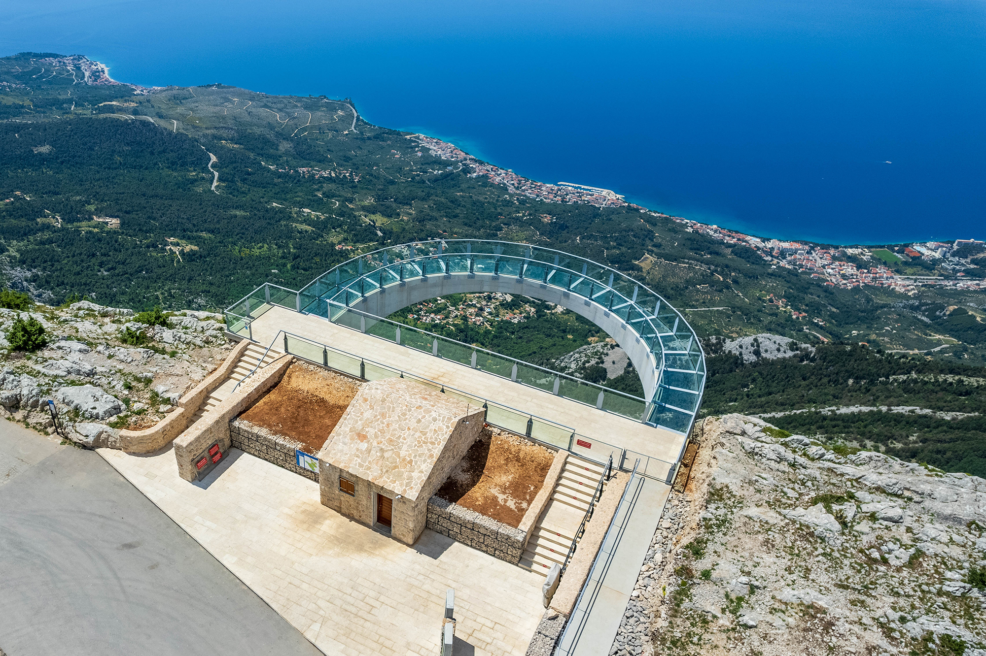 Der waghalsige Skywalk Biokovo liegt auf 1.228 Metern Höhe und ragt als hufeisenförmige Glasaussichtsplattform 11 Meter über die Klippen des Biokovo-Gebirges hinaus. Er bietet atemberaubende Blicke auf die tiefblaue Makarska-Riviera mit ihren Stränden und die Inseln Brač, Hvar sowie Vis. Bei klarem Wetter erscheint sogar der italienische Monte Gargano am Horizont, während Muflons und Steinadler die Szene beleben. Ergänzt wird der Standort durch eine geologische Säule, die die Schichten des Biokovo veranschaulicht.