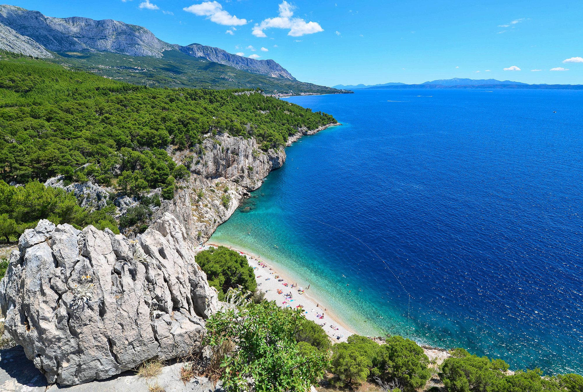 Makarska, eine der schönsten Küstenabschnitte Kroatiens, bieten kristallklares, türkises Wasser sowie traumhafte feine Strände wie der beliebte Gradska plaža oder der wildromantischen Strand Nugal.