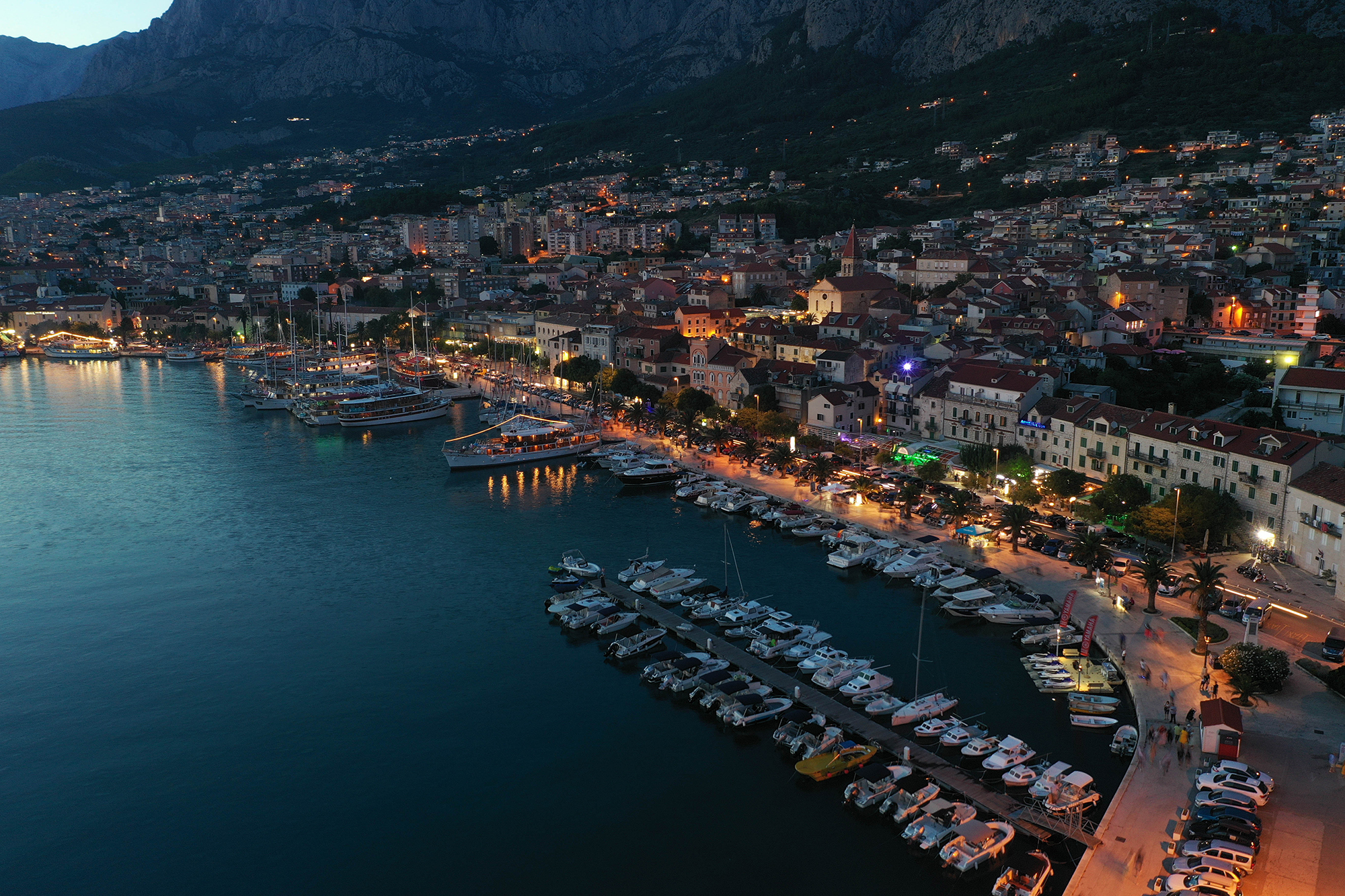 Luftaufnahme von Makarska nach Sonnenuntergang. (Foto: TZG Makarska; L33T digital agency; makarska-info.hr)