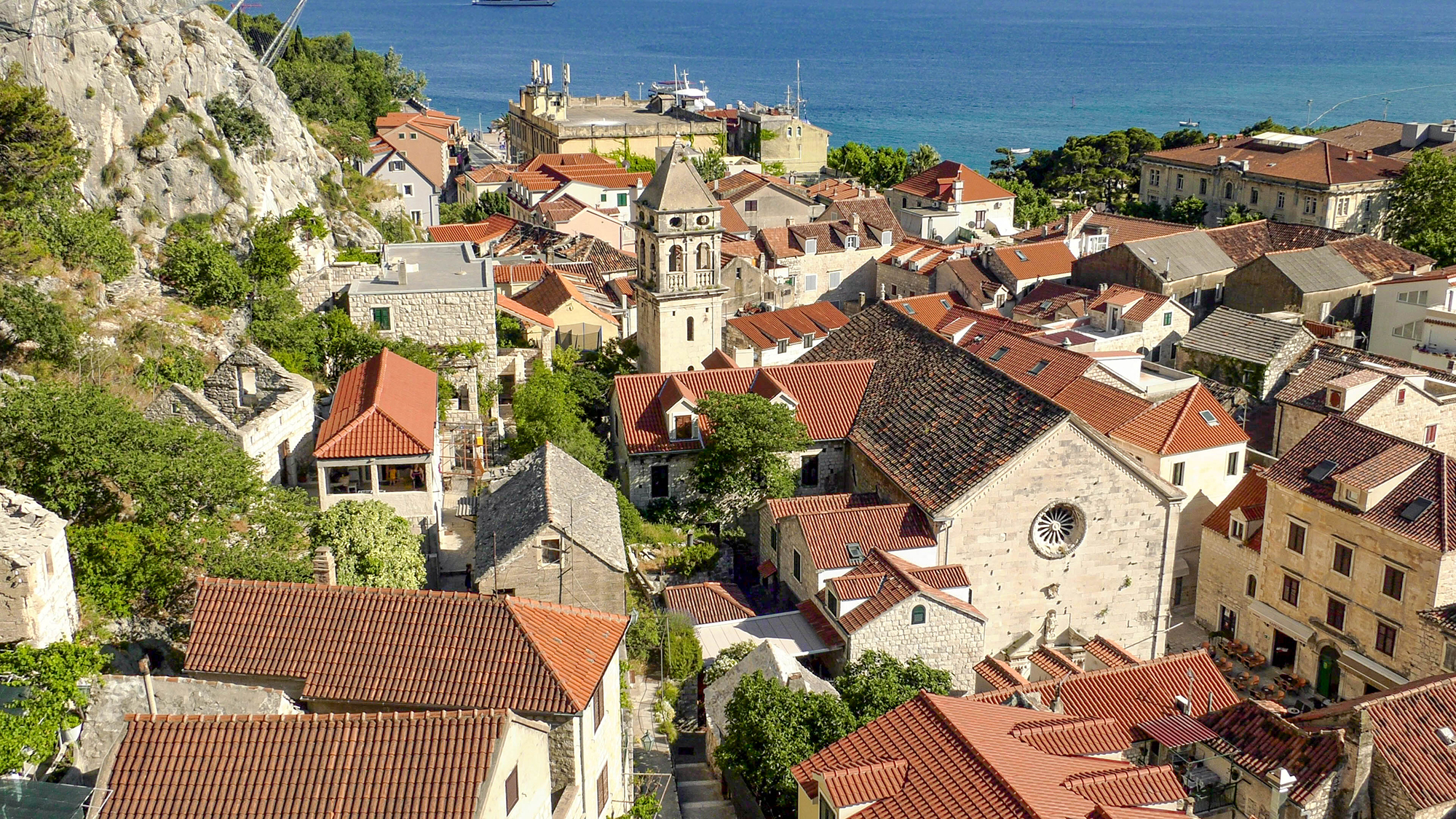 Panorama von der historischen Festungsanlage Starigrad (Fortica), die auf dem höchsten Punkt über der Stadt Omiš thront. (Foto: Kroati.de)