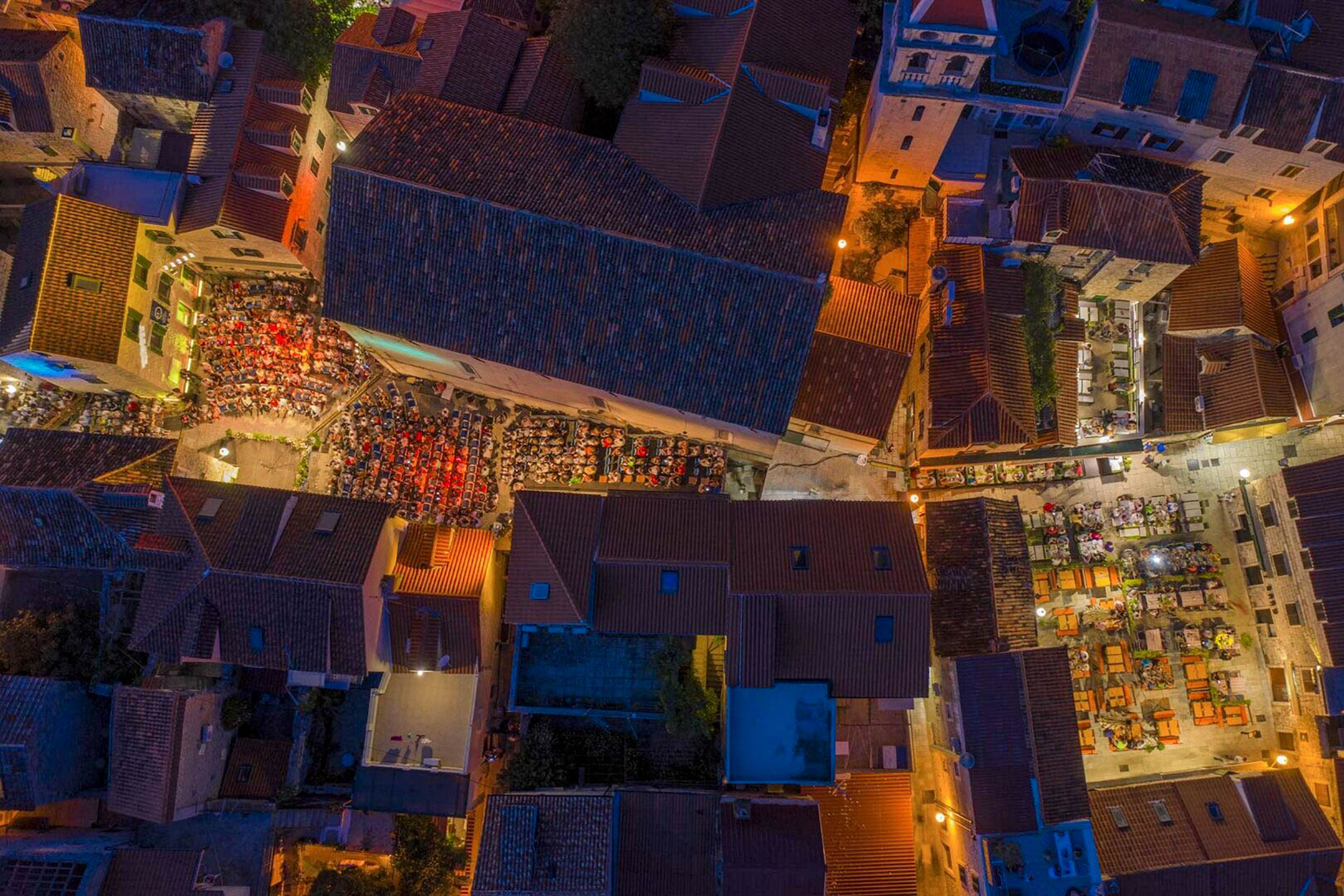 Luftaufnahme von der belebten Hauptstraße Pjaca in den Abendstunden. (Foto: Tz Omis; visitomis.hr)