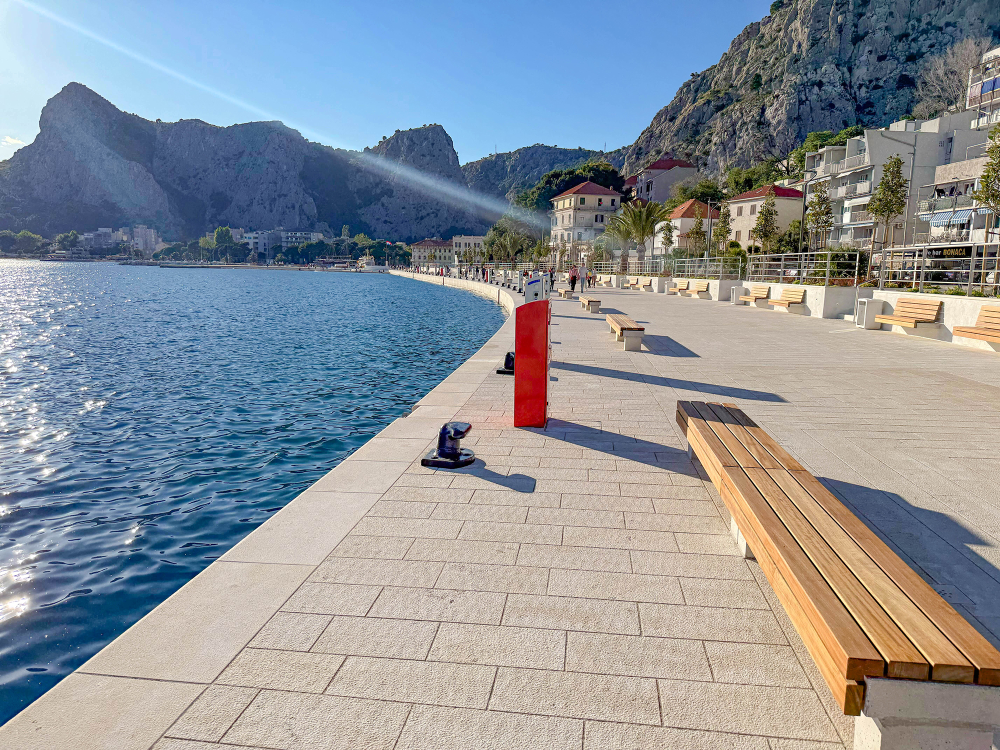 Nach rund 3,5 jähriger Bauzeit wurde im Frühjahr 2025 die hübsche Uferpromenade von Omiš fertiggestellt. Die ungefähr 400 m lange Promenade verbindet im Süden der Stadt den neuen Hafenbereich und verläuft bis zum beliebten Strand Brzet. In den Abendstunden lädt die Promenade zu romantischen Spaziergängen oder einfach zum Verweilen auf einer der vielen Sitzgelegenheiten, mit Blick auf das Meer und den Sonnenuntergang ein.
