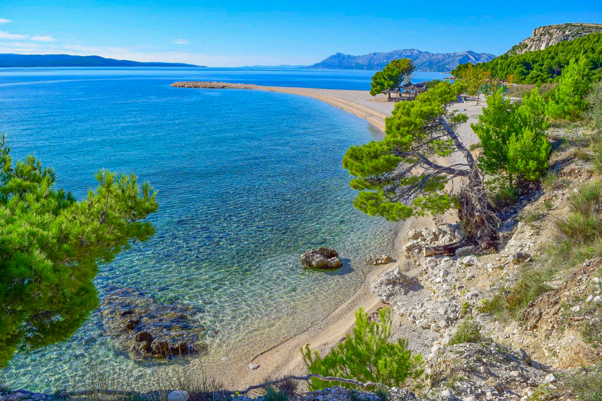 Kristallklares Wasser und heller Kiesel prägen die Küstenlinie von Makarska. Umrahmt vom mächtigen Biokovo-Gebirge bieten die Strände hier eine einzigartige Kulisse. Ideal für entspannte Stunden am Meer im Schatten der Pinienwälder.