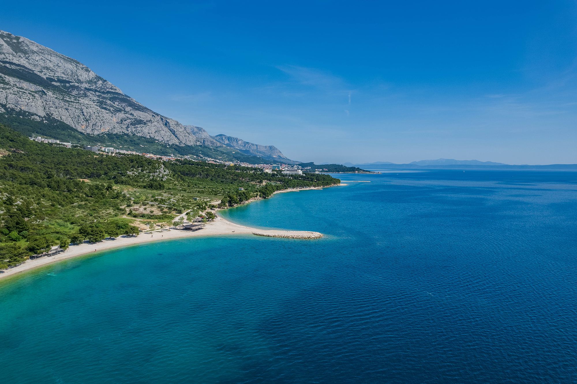 Biokovo-Gebirge benannte Kiesstrand liegt etwas nördlich des Zentrums unweit des gleichnamigen Hotels. Das Wasser ist glasklar und der sanfte Einstieg ins Meer ist auch für Kleinkinder und Nichtschwimmer geeignet. Pinien sorgen für natürlichen Schatten, während Besucher auch die Möglichkeit haben Liegen und Schirme zu mieten. Die Stimmung ist entspannt und eignet sich ideal für alle, die Erholung suchen. In Strandnähe befinden sich zusätzliche Gastronomiebetriebe, die für angenehme Erfrischungen sorgen.
