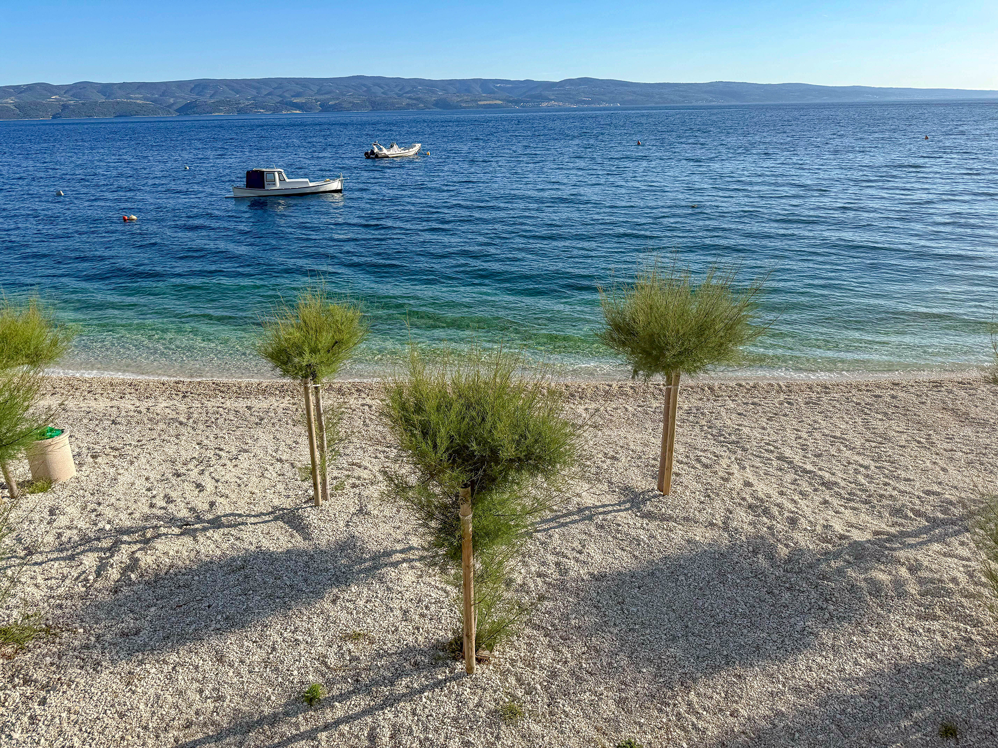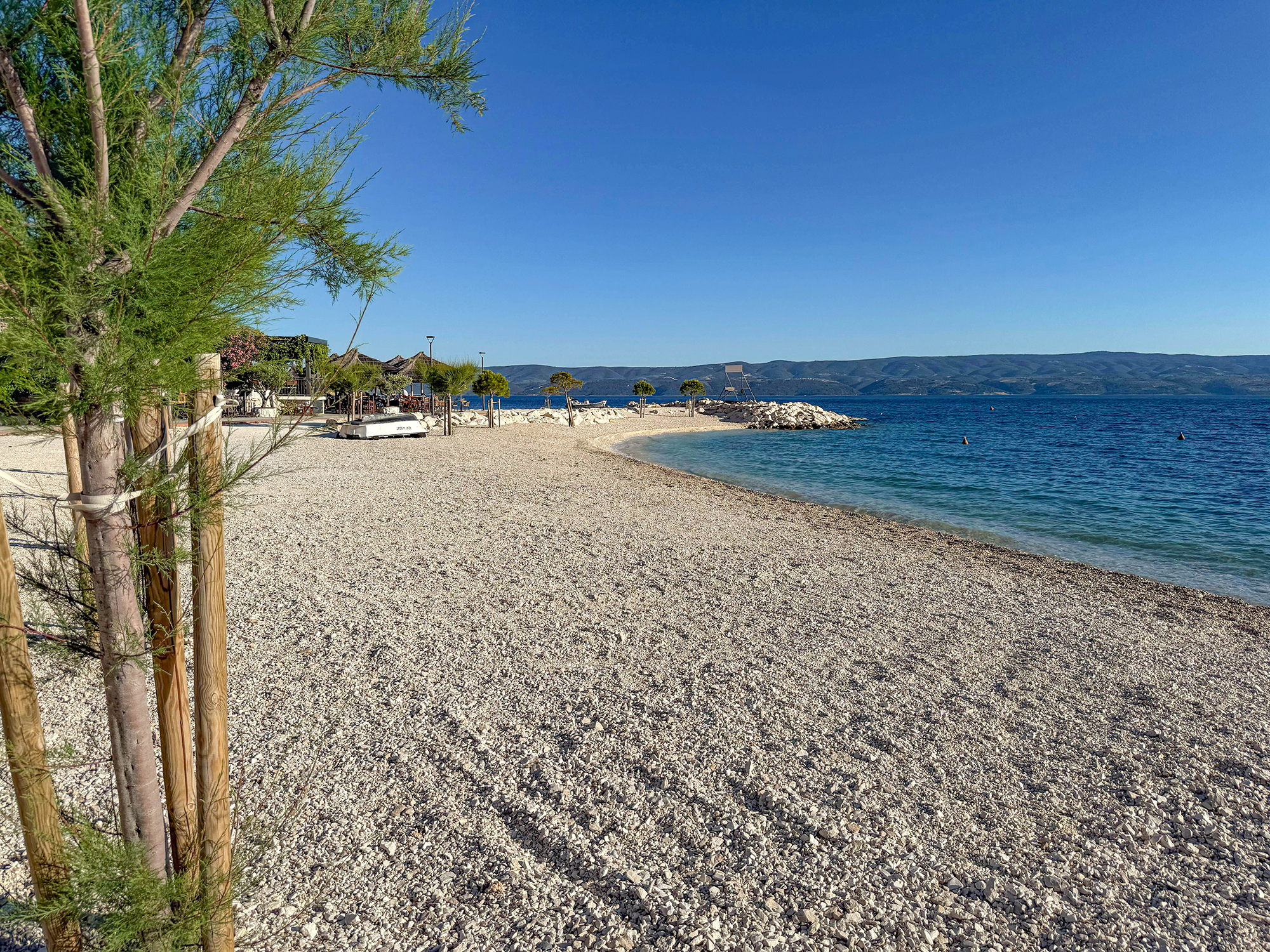 Die feinen Kieselsteine am Strand, lassen das glasklare, türkisblaue Wasser besonders leuchten. Sie sorgen zudem für einen leichten und angenehmen Zugang zum Meer, dessen ausgezeichnete Sauberkeit geschätzt wird. Der Strand Brzet wird gesäumt von duftenden Kiefern und weiteren, extra am Strand gepflanzten Bäumen, welche natürlichen Schatten spenden. Es empfiehlt sich jedoch, frühzeitig am Strand einzutreffen, da die begehrtesten Plätze unter den Baumkronen rasch belegt sind.