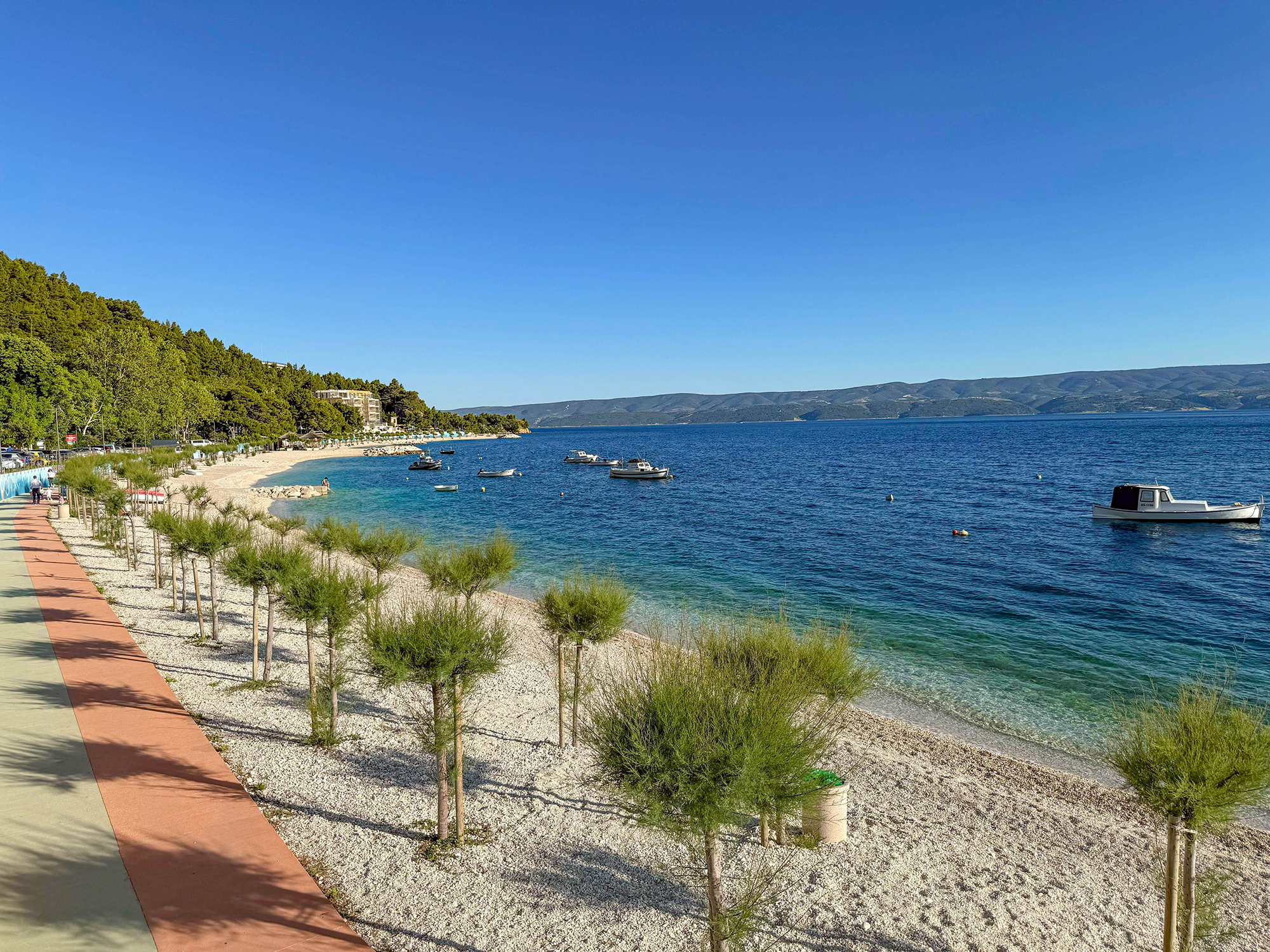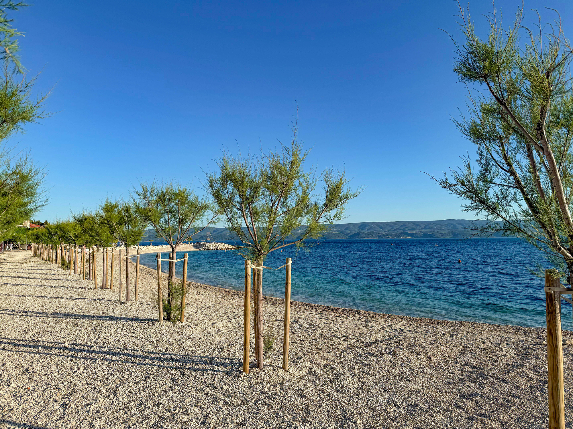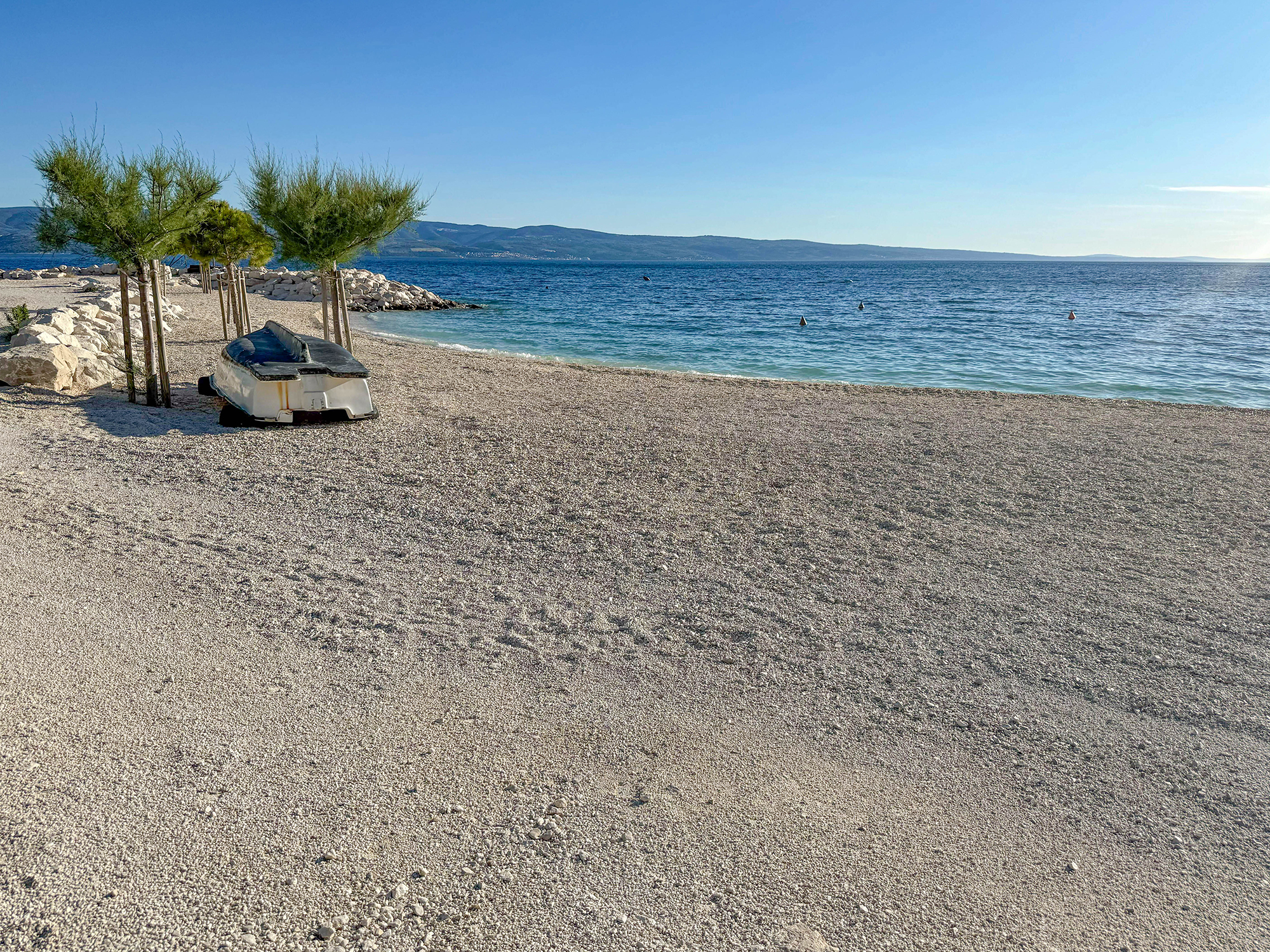 Charakteristisch für diesen Strand sind die feinen Kieselsteine, die dem Meer eine klare, türkisblaue Färbung verleihen. Das Wasser ist für seine hervorragende Qualität und Sauberkeit bekannt. Die Küstenpromenade verläuft direkt am Strand und lädt zum entspannten Flanieren ein, was den hohen Erholungswert des Ortes zusätzlich unterstreicht. Dank der ruhigen Brandung und des flachen, klaren Wassers ist Brzet ein idealer und sicherer Badeplatz für die ganze Familie.