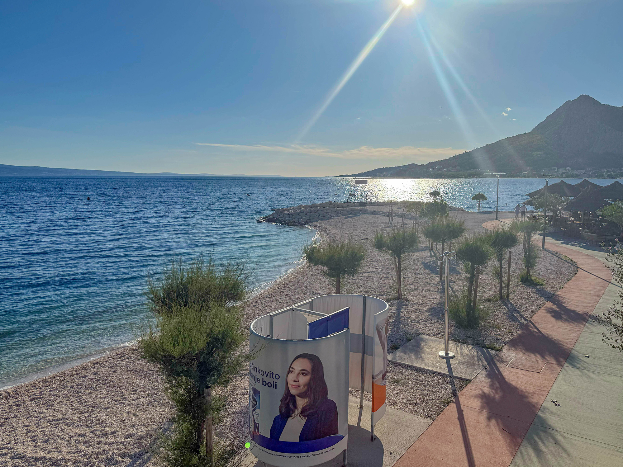 Strand Velika Plaza in Omiš, wo es einen Lift an einer Mole gibt, die den barrierefreien Zutritt zum Meer für Menschen mit besonderen Bedürfnissen gewährleisten.