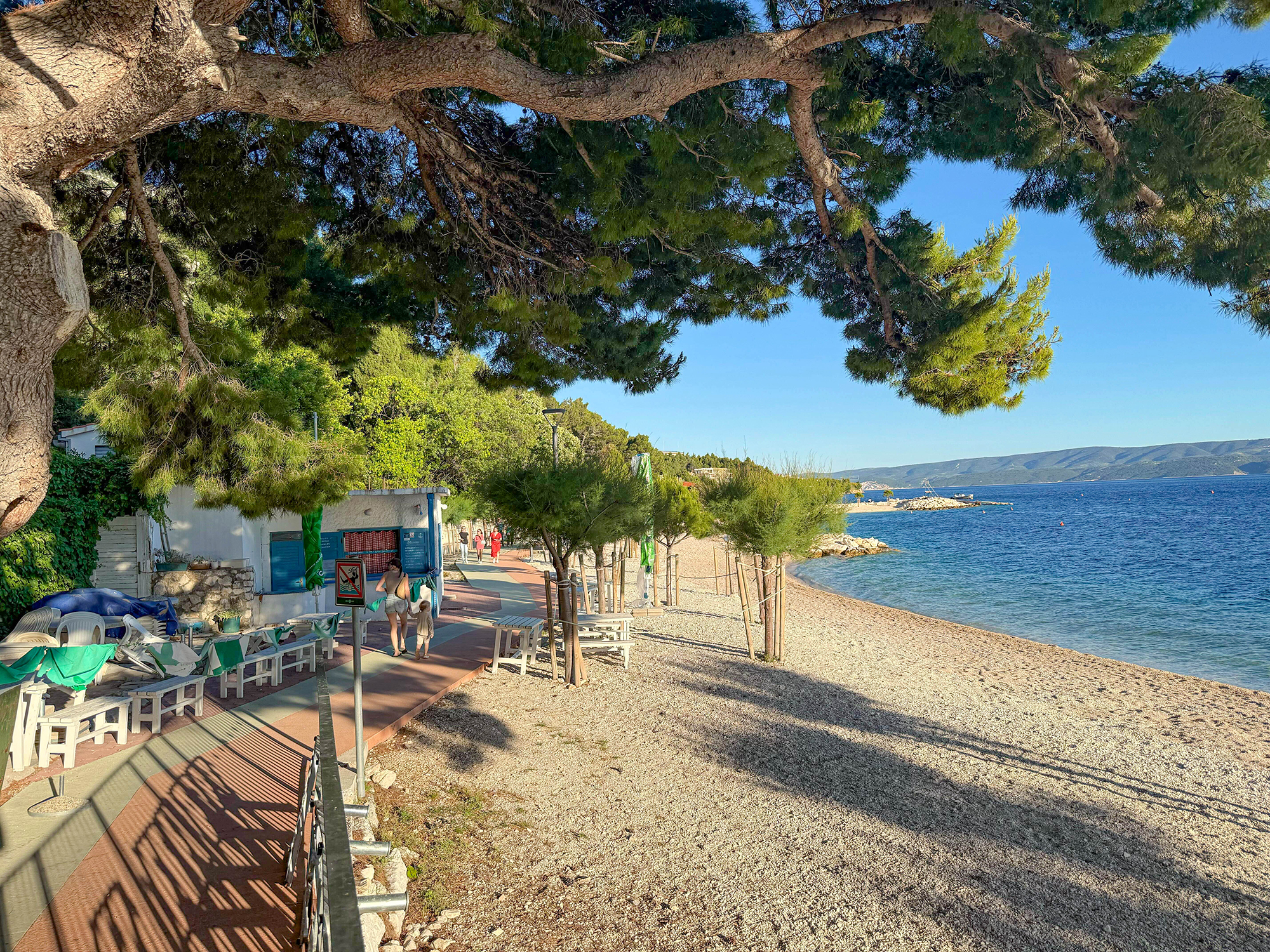 Direkt am Strand spenden wohlduftende Pinienbäume und Aleppokiefern, die extra am Strand gepflanzt wurden, Schatten. Der Strand Brzet ist ein beliebtes Ziel für Familien und Erholungssuchende, die den Komfort einer touristisch erschlossenen Gegend nicht missen möchten. Durch die westliche Ausrichtung genießt man beim Baden im Meer einen atemberaubenden Ausblick auf das historische Omiš und die dahinter liegende, imposante Berglandschaft – ein Bild wie aus einem exklusivem Reisemagazin.