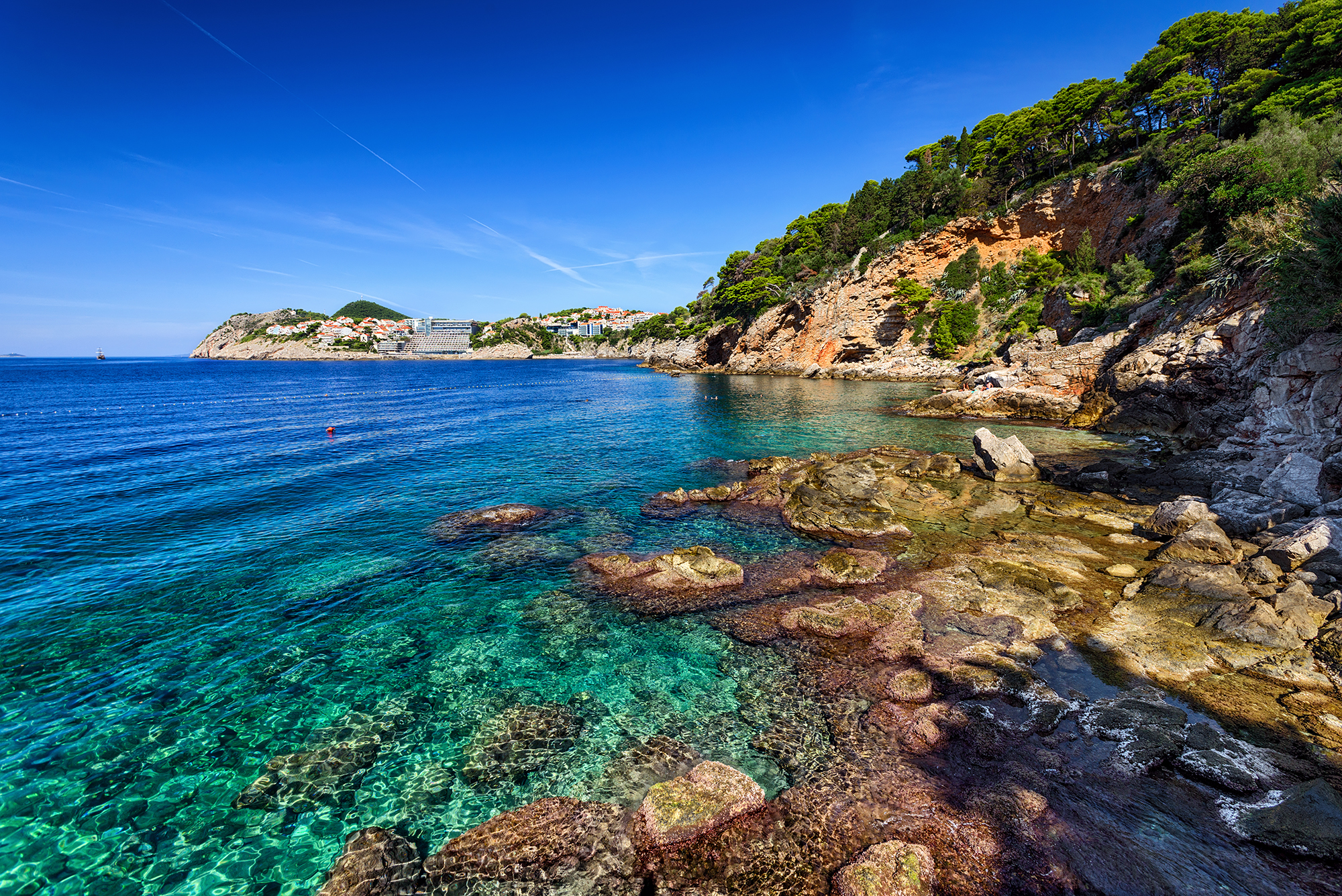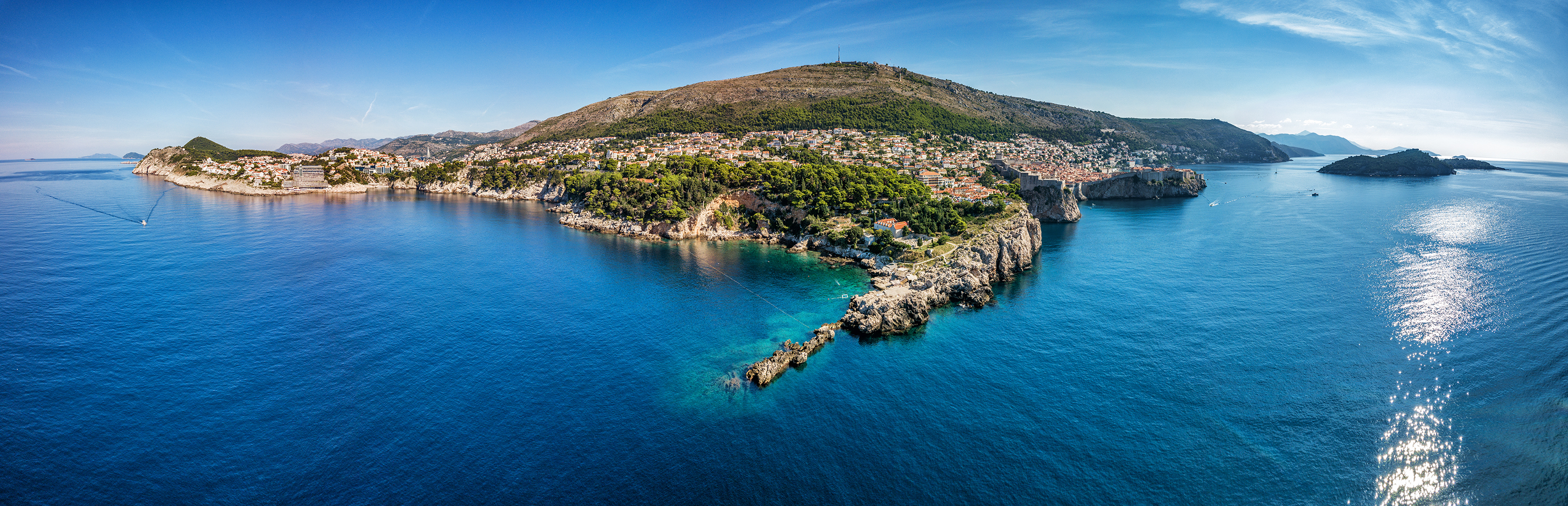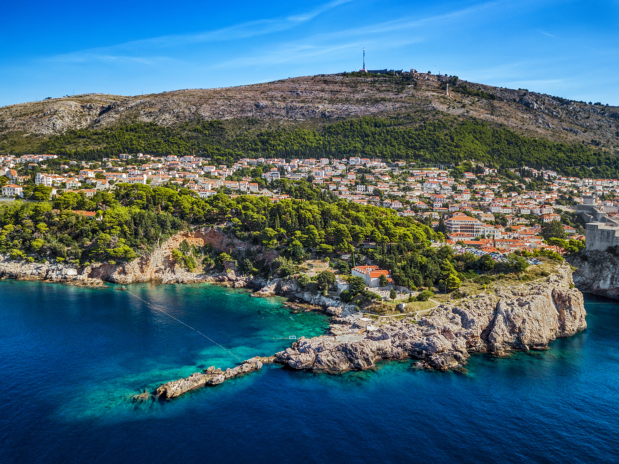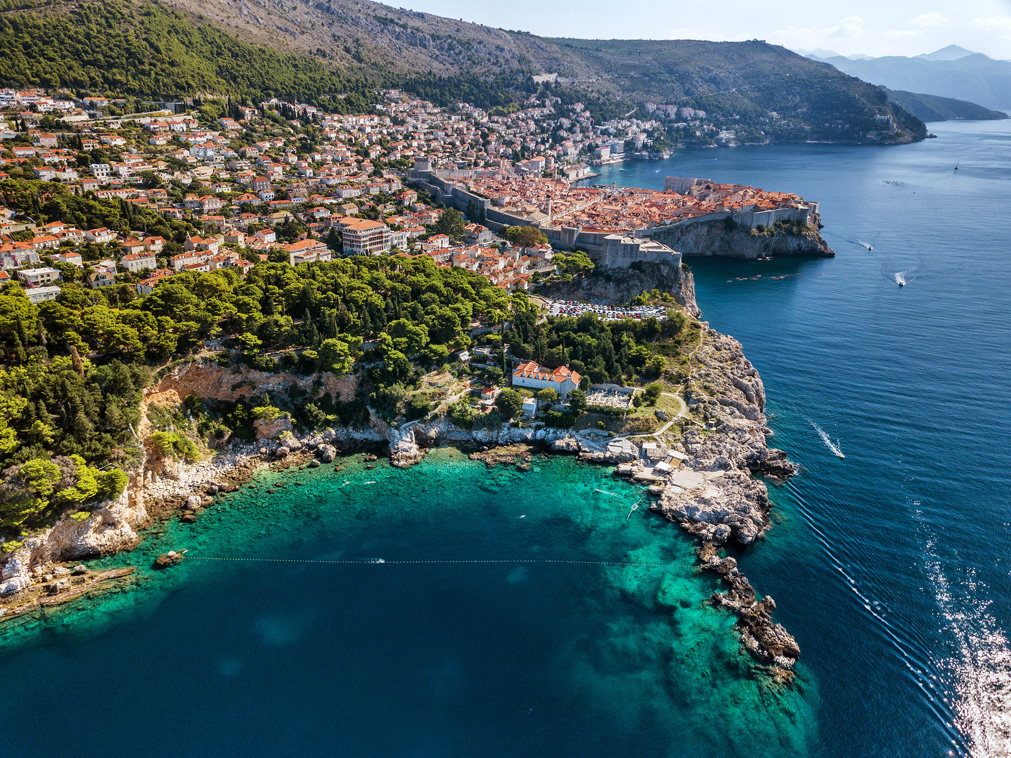 Dubrovnik, die sich gleich dahinter erstreckt. Dieses beeindruckende Zusammenspiel aus Natur und mittelalterlicher Architektur machen den Weg zum Strand bereits zu einem unvergesslichen Erlebnis.