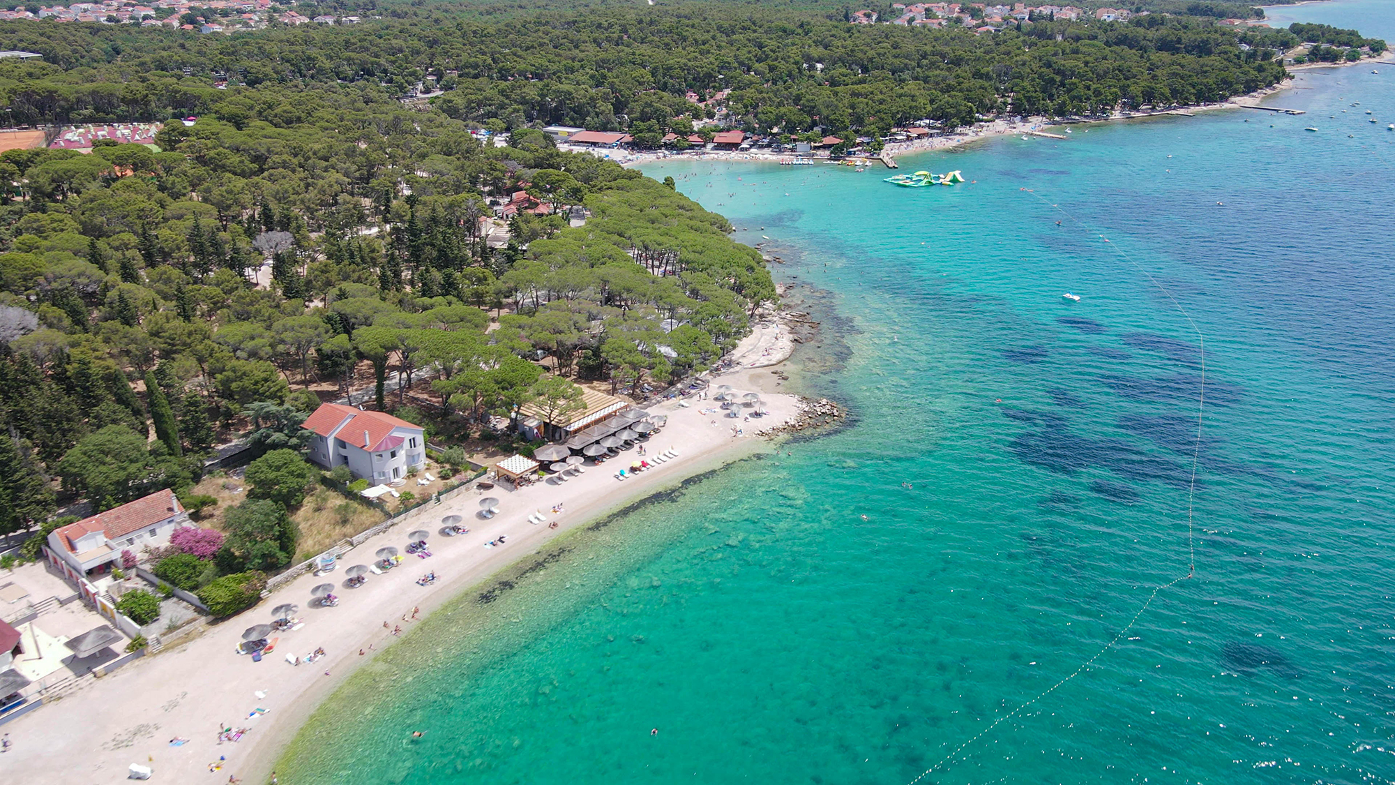 Biograd na Moru. Er ist eingebettet in die malerische Landschaft, gesäumt von duftenden Kiefernwäldern und bietet einen traumhafter Inselblick auf die vorgelagerte Insel Pasman. Die Uferzone fällt seicht ins Salzwasser der Adria ab und auch Rettungsschwimmer überwachen den Strand, was ihn besonders familienfreundlich und sicher für Kinder macht und deshalb bei Einheimischen und Touristen sehr beliebt ist. Der Dražica Strand ist ein pulsierender Treffpunkt, der die pure kroatische Lebensfreude verkörpert. Erleben Sie hier einen entspannten Strandtag oder belebende Action am Wasser.