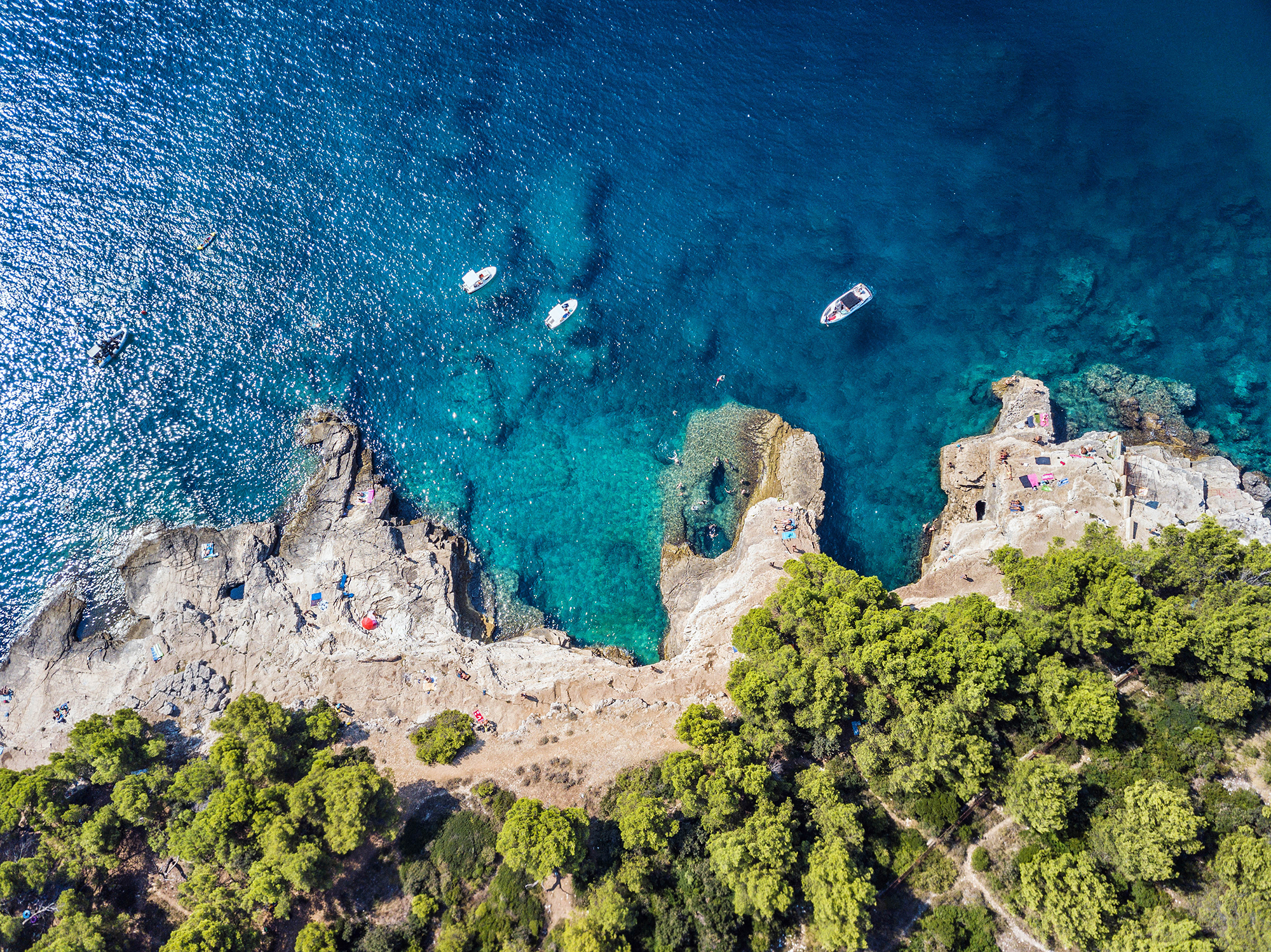 Der Strand Galebove Stijene aus der Vogelperspektive, beeindruckt durch seine wunderschönen Meeresfarben und mediterranen Grüntönen. (Foto: Croatia.hr; Aleksandar Gospic)