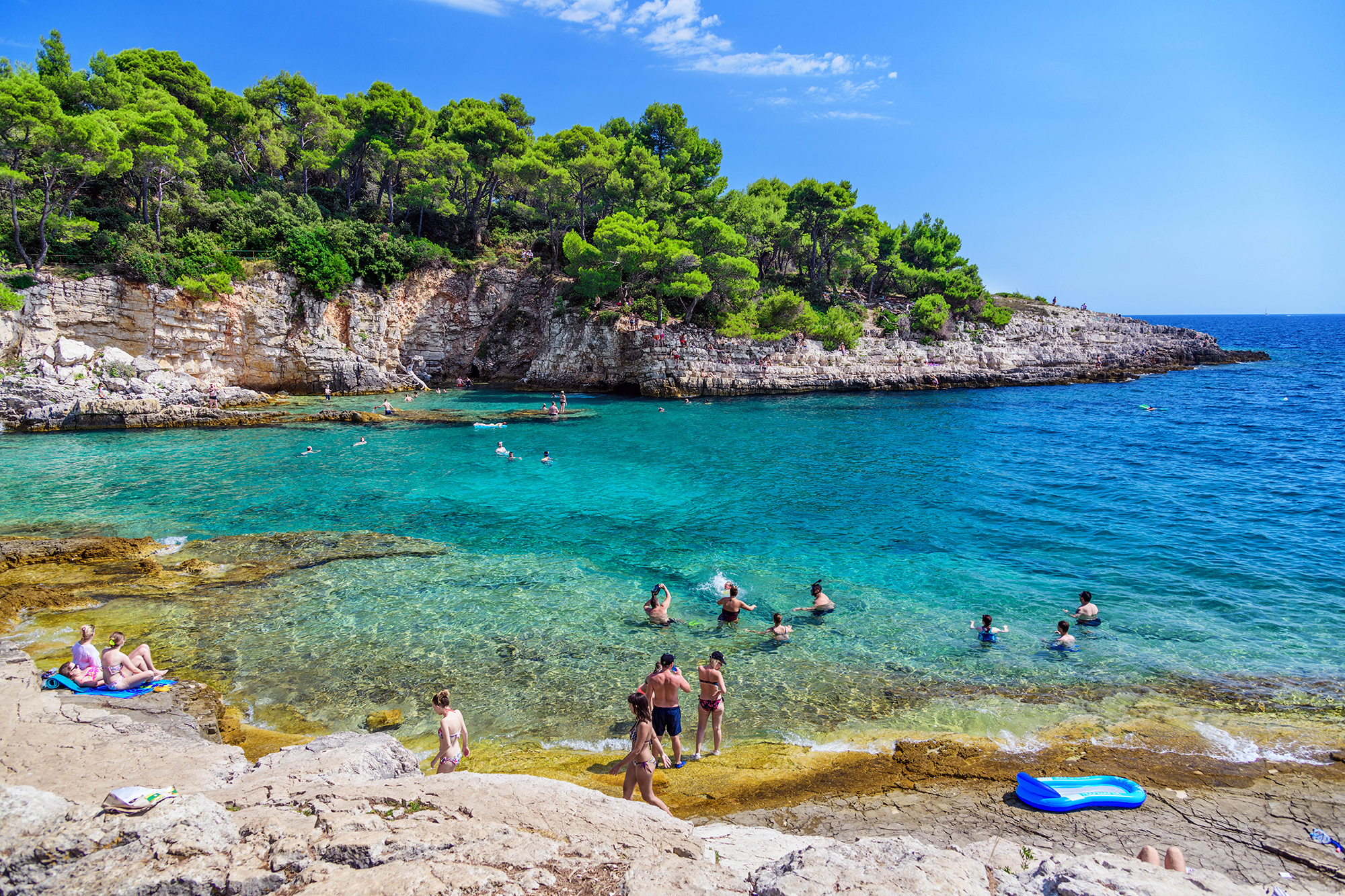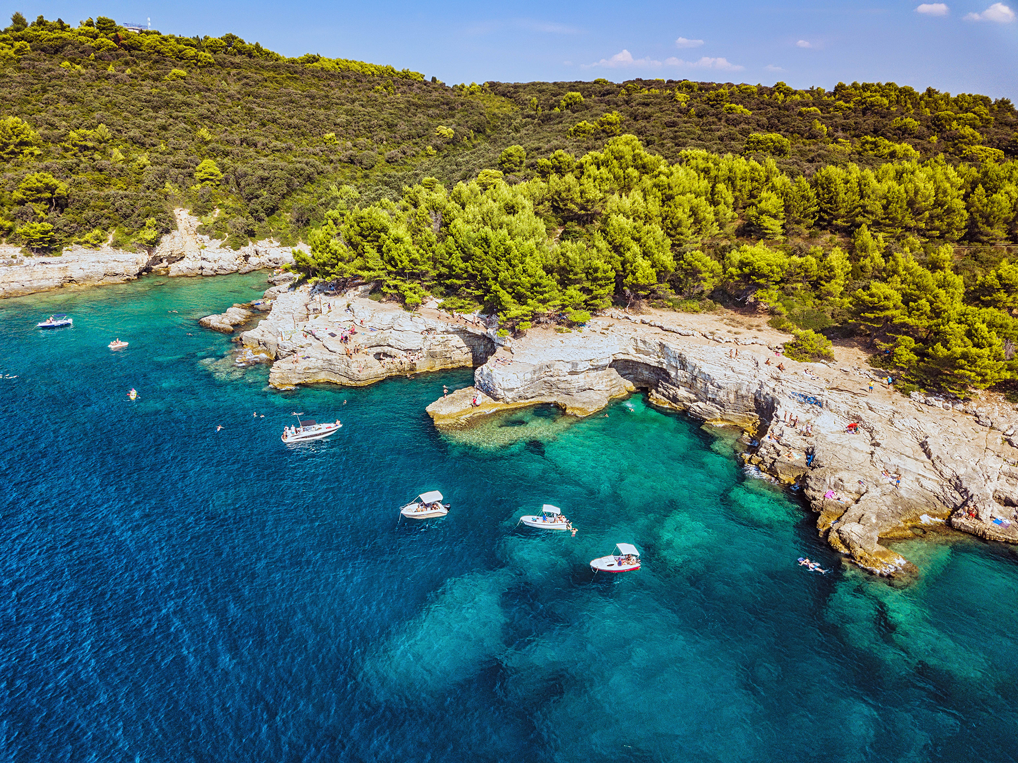 Amphitheater, sondern auch für seine wunderschöne Küste. Am westlichen Rand der Stadt, am Ende der Küstenpromenade Lungomare, auf einer Landzunge, liegt der spektakuläre Strand Galebove Stijene, was übersetzt „Möwenfelsen“ bedeutet. Sein Name ist Programm, denn hier stürzen schroffe, von Wind und Meer geformte Felsformationen dramatisch ins tiefe Blau der Adria. Dieser wilde, naturbelassene Strand lockt vor allem Abenteuerlustige und junge Leute an, die das Außergewöhnliche suchen.