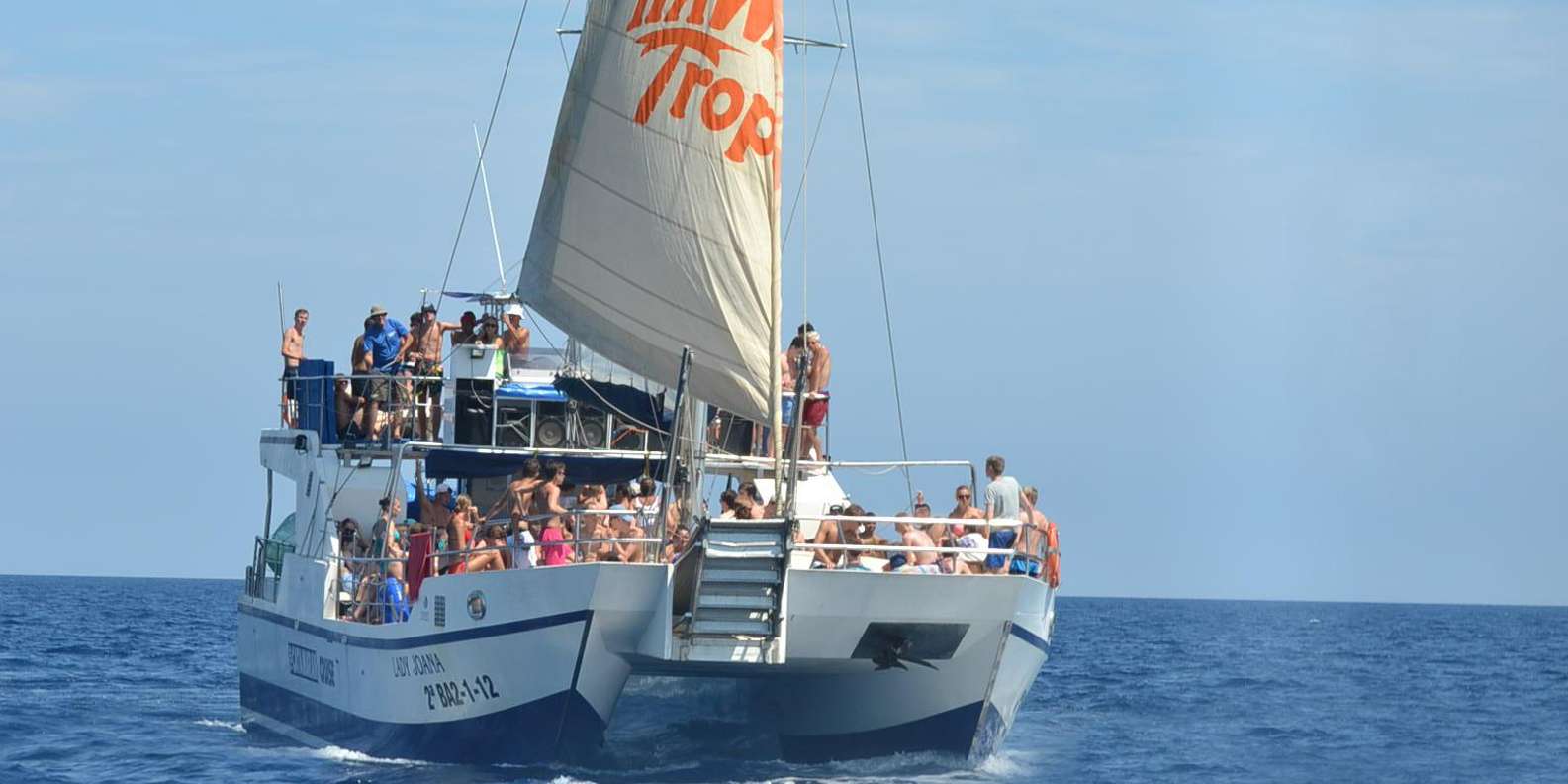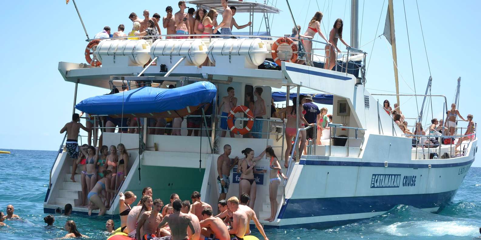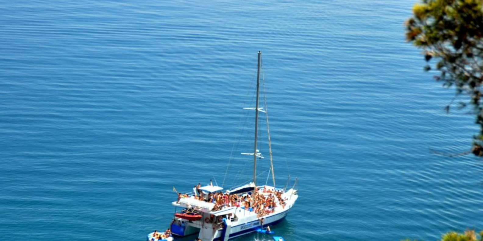 Eine gute Zeit zu haben ist das Wichtigste, deshalb gibt es auf dem Katamaran viele Wasseraktivitäten. Es gibt nichts Besseres, als mit deinen Freunden von der Spitze des Bootes zu springen, die Wasserrutsche hinunter zu sausen, auf dem Trampolin zu springen oder einfach mit einem kalten Bier im Wasser zu entspannen. Wenn du Lust hast, die Meeresbewohner des Mittelmeers zu beobachten, brauchst du nur eine Schnorchelausrüstung mitzunehmen, die an Bord vorhanden ist.