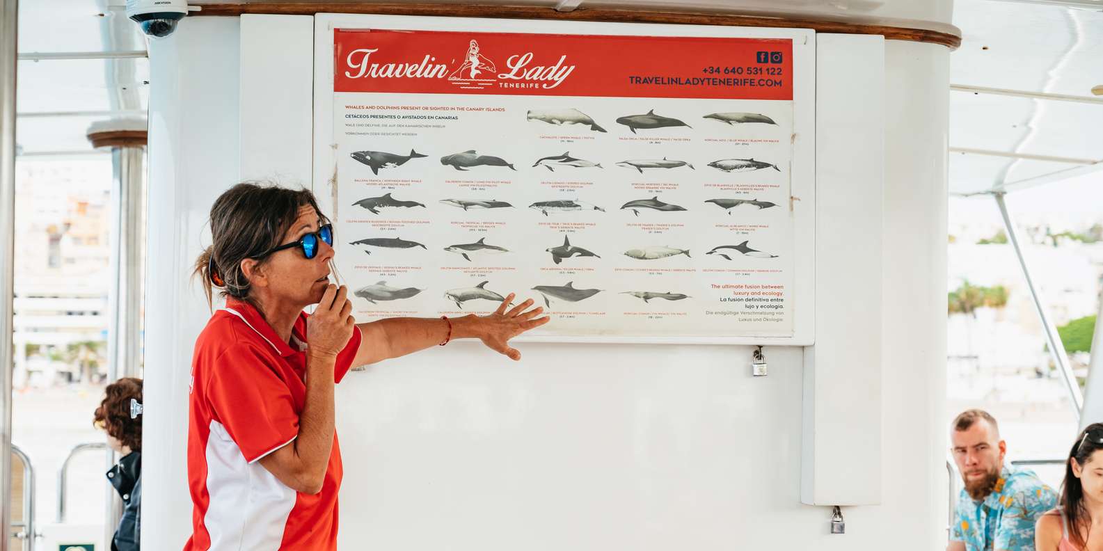 Entdecke die Travelin Lady, eine luxuriöse Öko-Yacht, die gebaut wurde (es ist das einzige Boot auf den Kanarischen Inseln, das für Whale Watching-Aktivitäten gebaut wurde) und sowohl Steuerbord- als auch Backbordseite nahe dem Meeresspiegel hat.