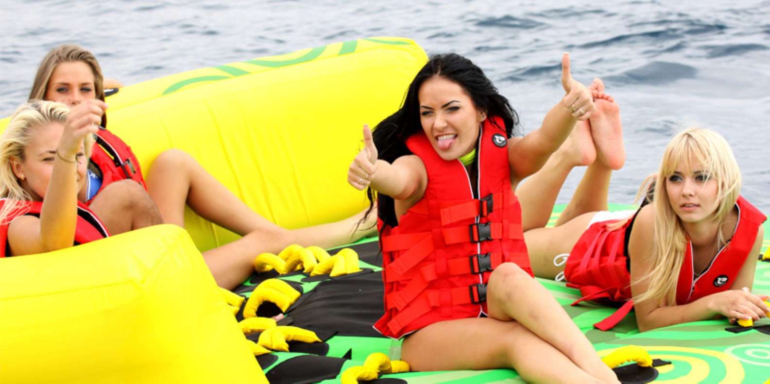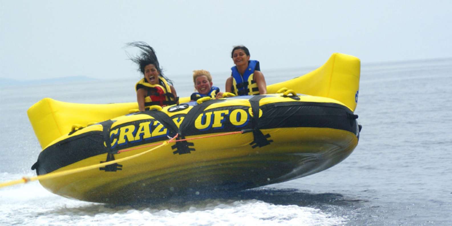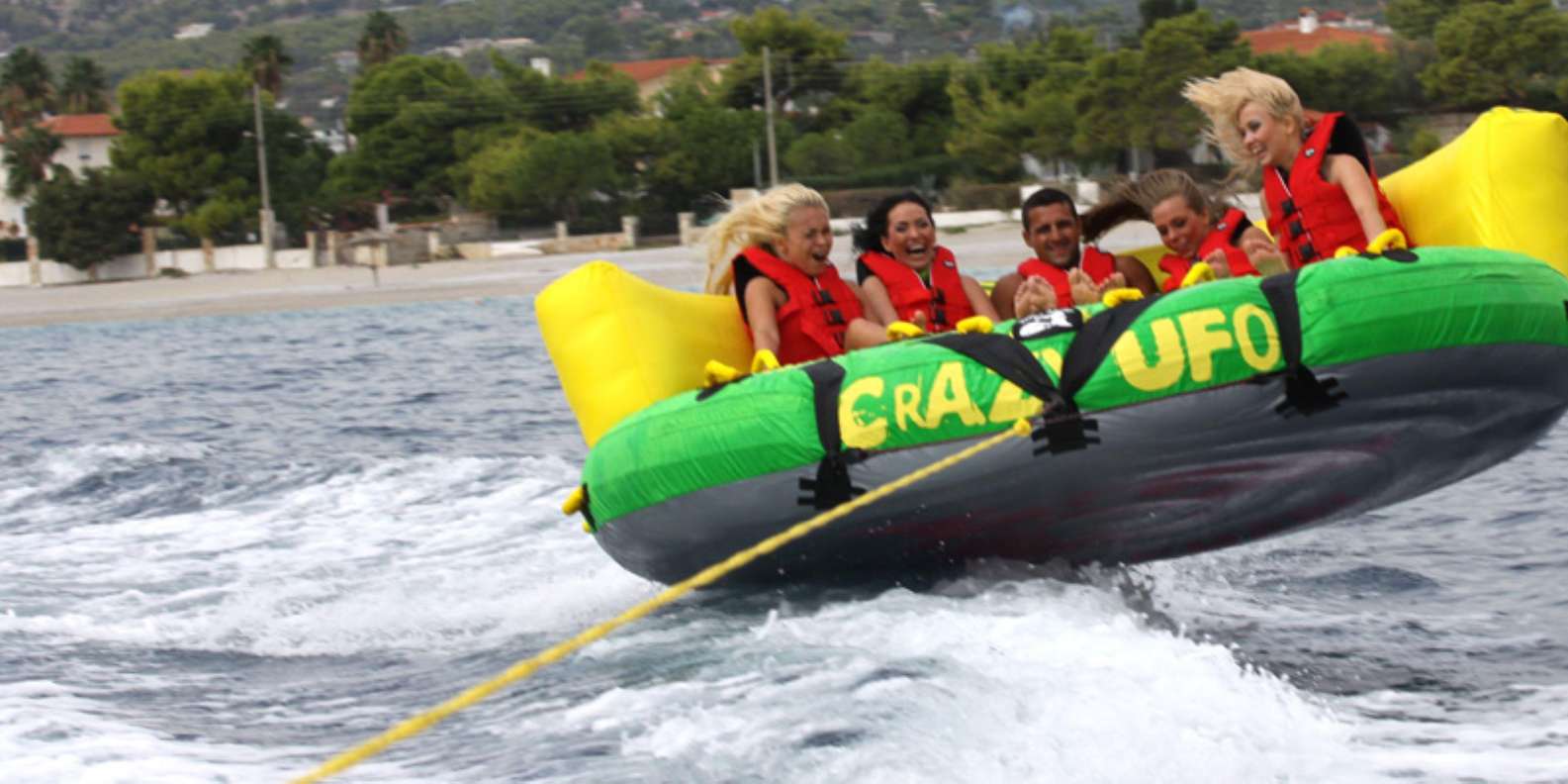 - Erlebe den ultimativen Nervenkitzel mit einem riesigen Schwimmreifen, der von einem Schnellboot gezogen wird.