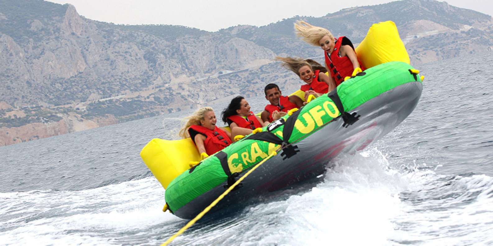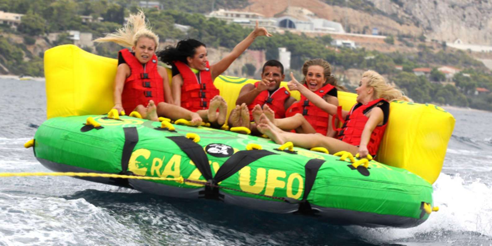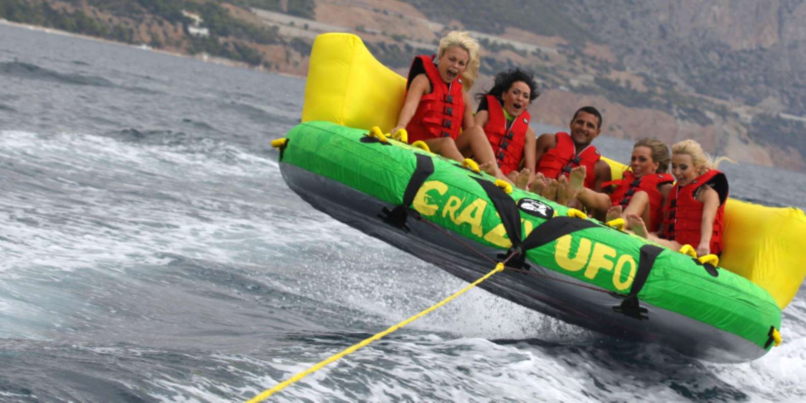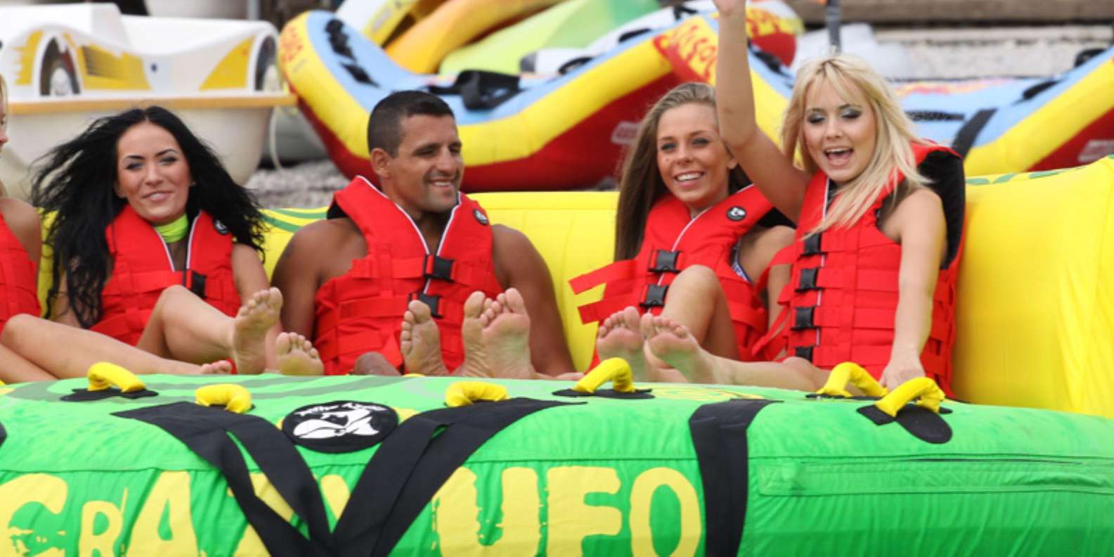 - Erlebe den ultimativen Nervenkitzel mit einem riesigen Schwimmreifen, der von einem Schnellboot gezogen wird.